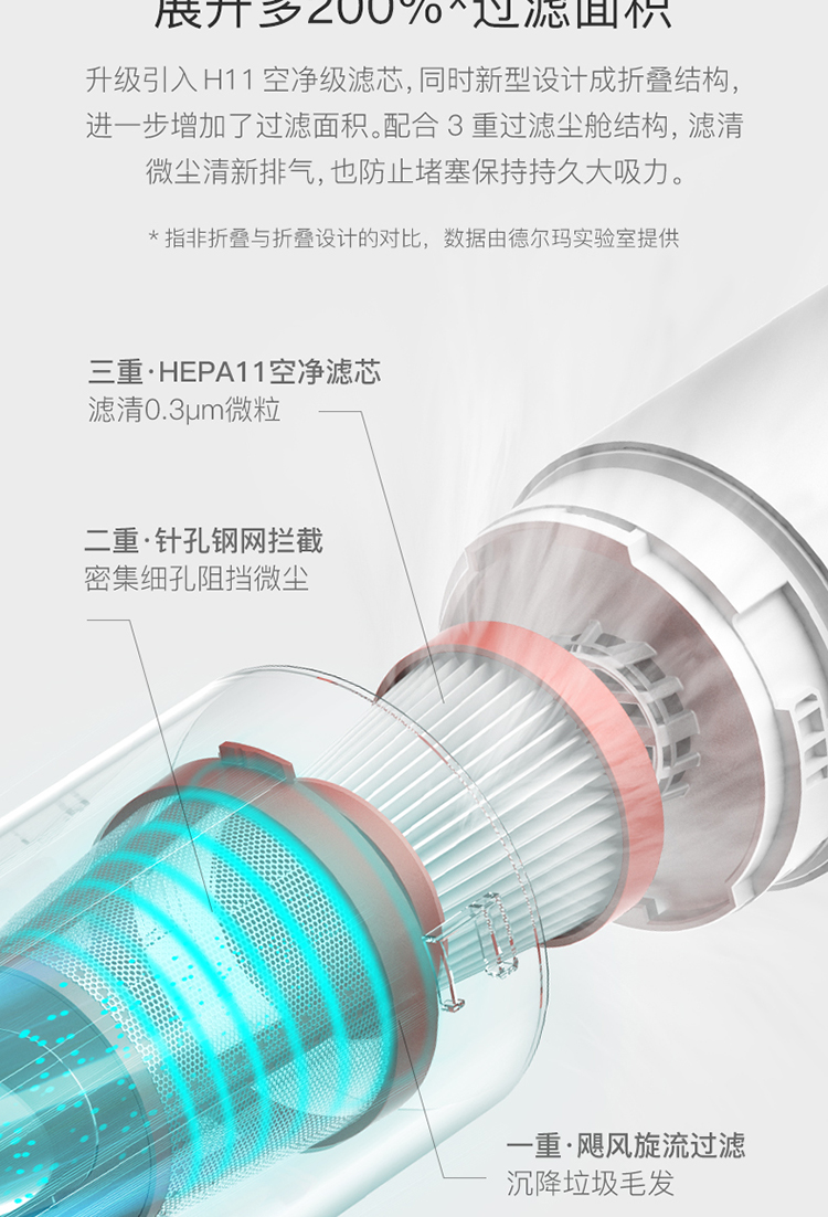 细节上:升级引入H11空净级滤芯,新型折叠结构,展开过滤面积约提升了200%,配合3重过滤尘舱结构,滤清微尘清新排气,也防止堵塞保持持久大吸力。