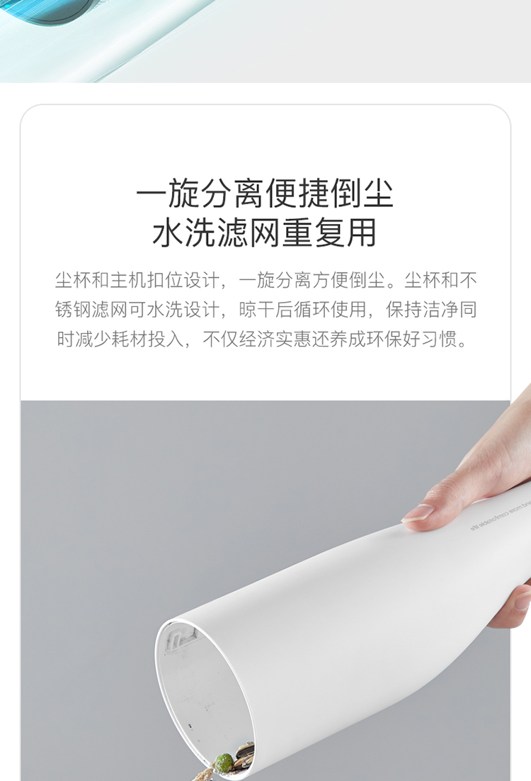 尘杯和主机扣位设计,一旋分离方便倒尘。尘杯和不锈钢滤网可水洗设计,晾干后循环使用,保持洁净同时减少耗材投入,不仅经济实惠还养成环保好习惯。