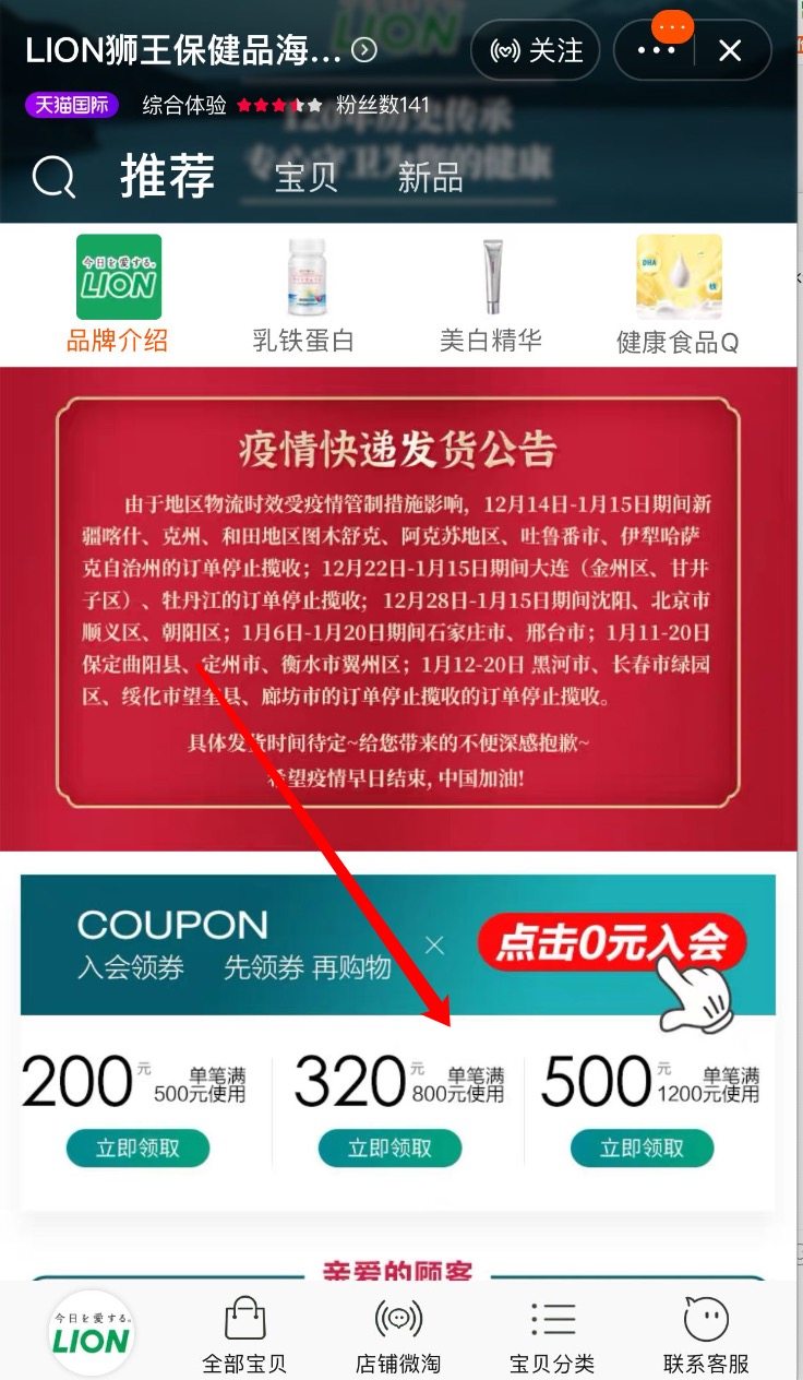 天猫LION狮王保健品海外旗舰店809元,下单立减240元,可领240元优惠券(店铺首页入会领取,所有券领一遍),实付329元到手,规格是93粒*2瓶,合164.5元/瓶。