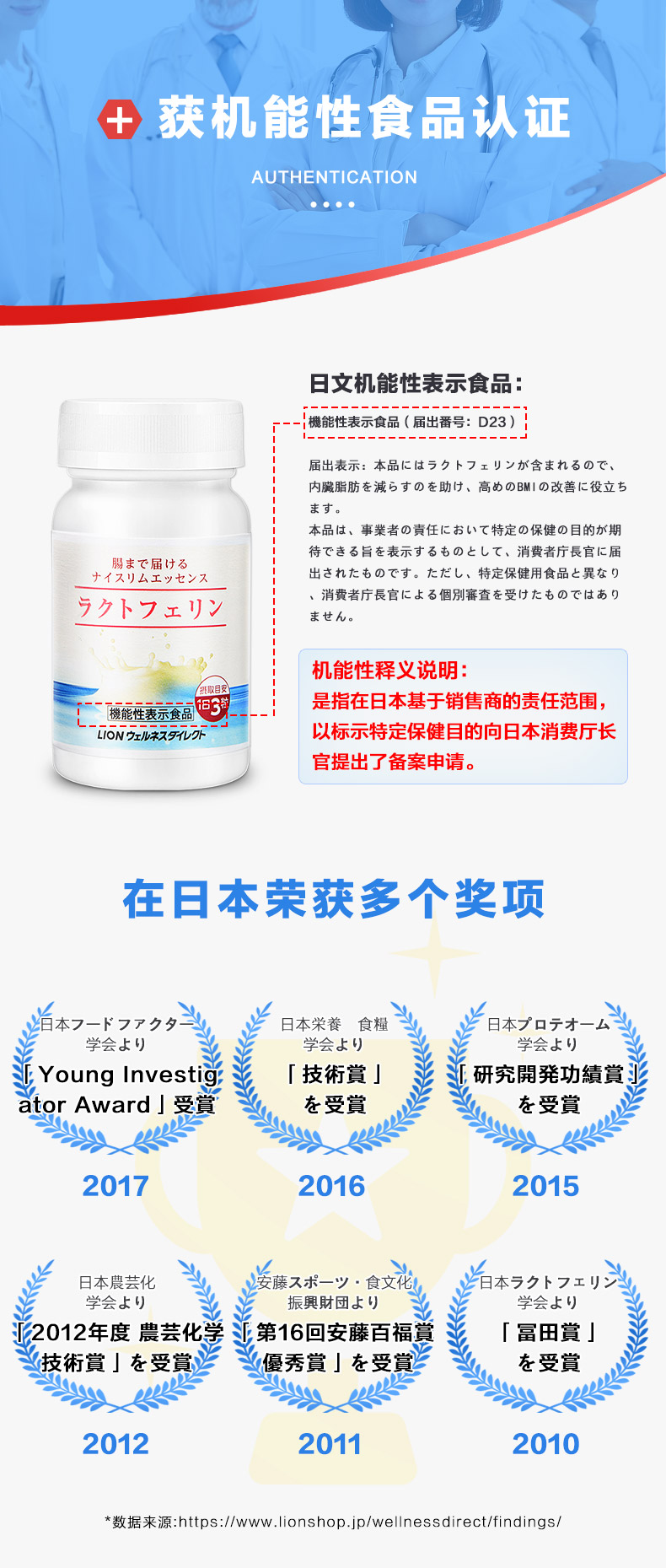 “乳铁蛋白”为日本狮王率先发现实验证明,并通过独特技术独立研发制成了“乐菲灵”。一般情况下,即使摄入了,也会被胃酸和消化酵素在到达肠道之前就会被分解掉,狮王采用其独家涂层技术,保证乳铁蛋白在胃酸中不被溶解,成功送达肠道,针对肠道周围脂肪细胞,并作用内脏脂肪细胞,促进分解,并抑制合成。规格:93粒/瓶,每粒含量高达100mg乳铁蛋白,建议:每日服用3粒,备孕、孕期、哺乳期女性请咨询医生。
