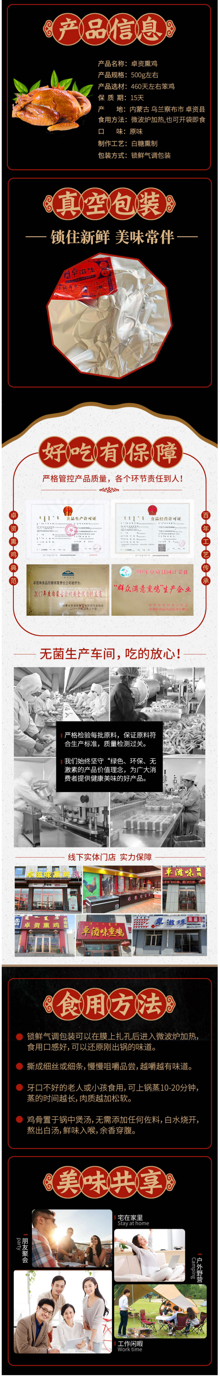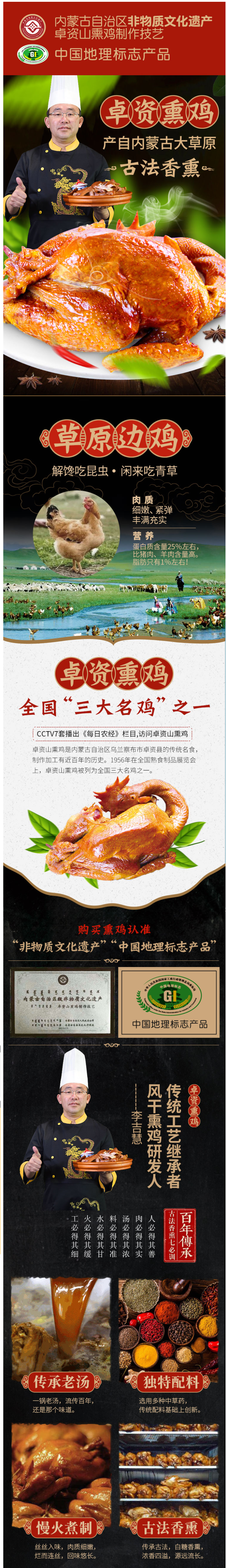 卓资熏鸡以个大体肥、色泽红润、味道鲜美、肉质细嫩而闻名,熏鸡的制作技艺,入选第四批内蒙古自治区级非物质文化遗产名录。2016年9月21日,正式成功注册国家地理标志证明商标。