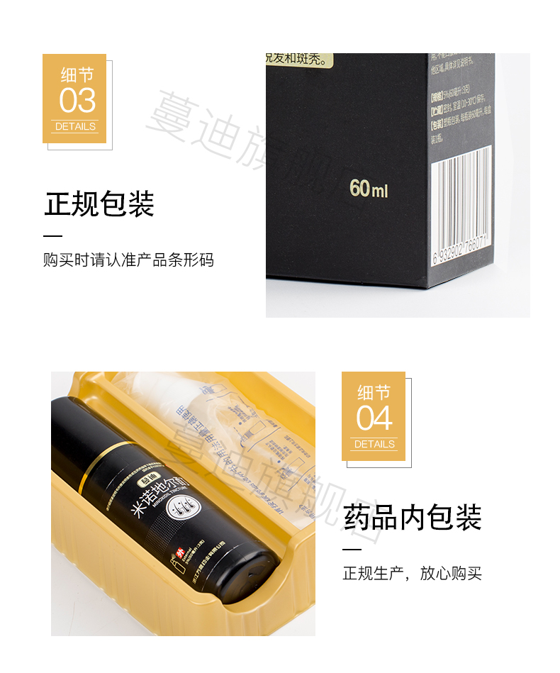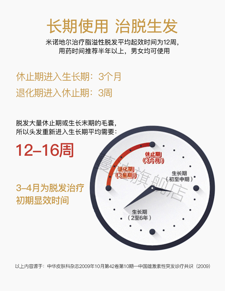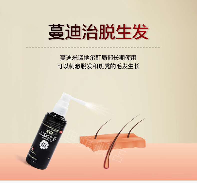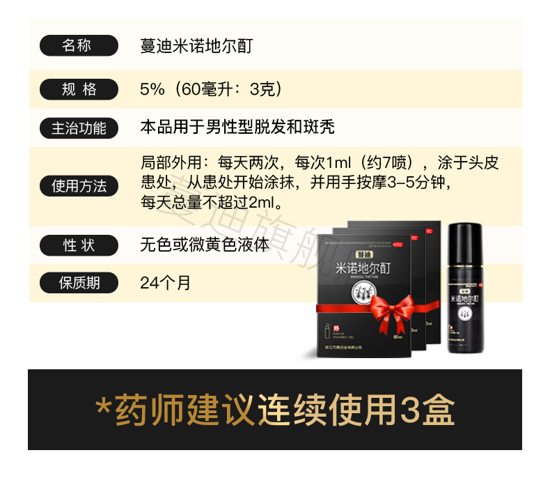 这款是国药准字OTC非处方药,是市面上真实有效的生发药用品,成份为米诺地尔,是一种周围血管舒张药,局部长期使用时,可刺激男性型脱发和斑秃患者的毛发生长。适用于男性雄激素源性脱发、女性雄激素源性脱发、斑秃患者。