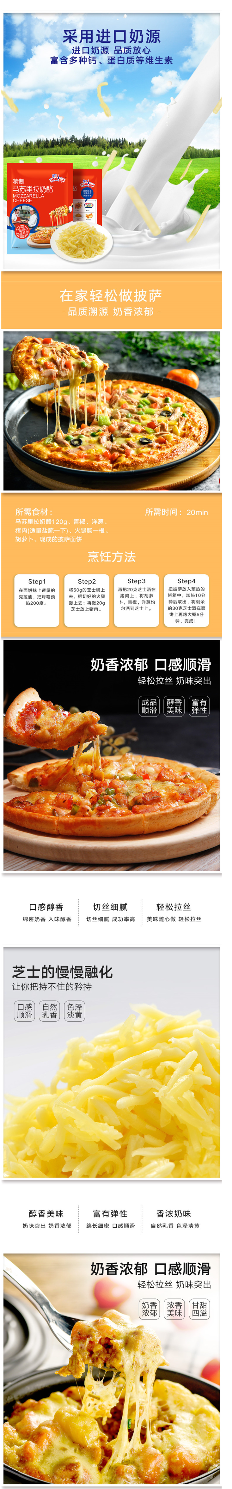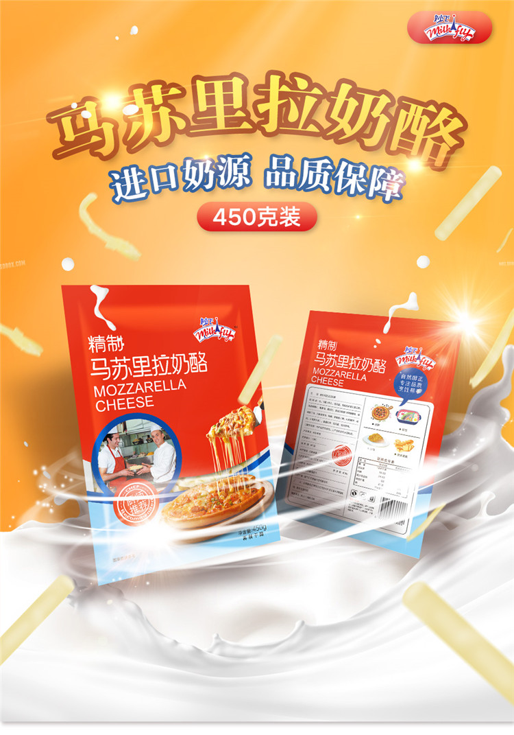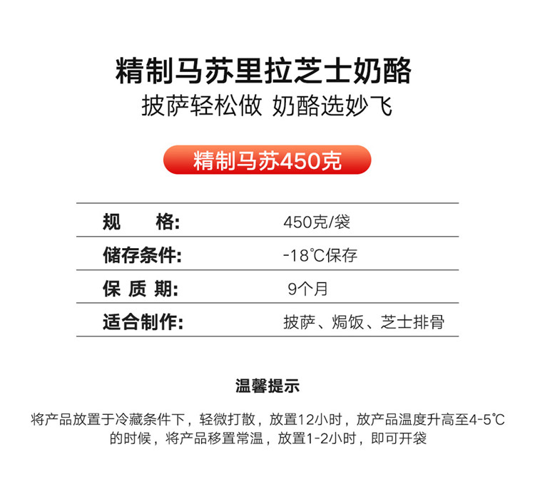 这款妙飞 超级飞侠 马苏里拉芝士碎,使用进口奶源制成,切丝细腻,拉丝长绵,效果好,润滑且富有弹性,奶香也浓郁,拉丝无需切块,直接使用可用于制作披萨、炒饭。