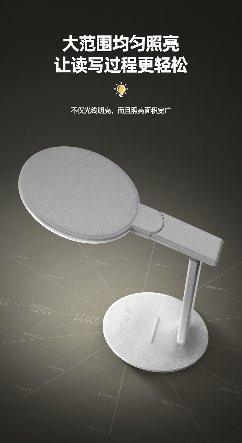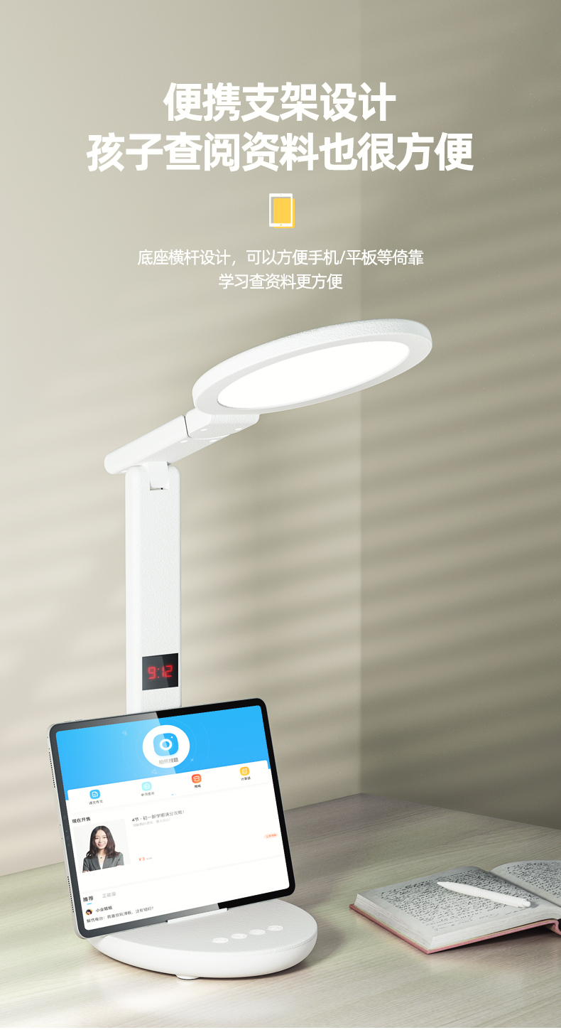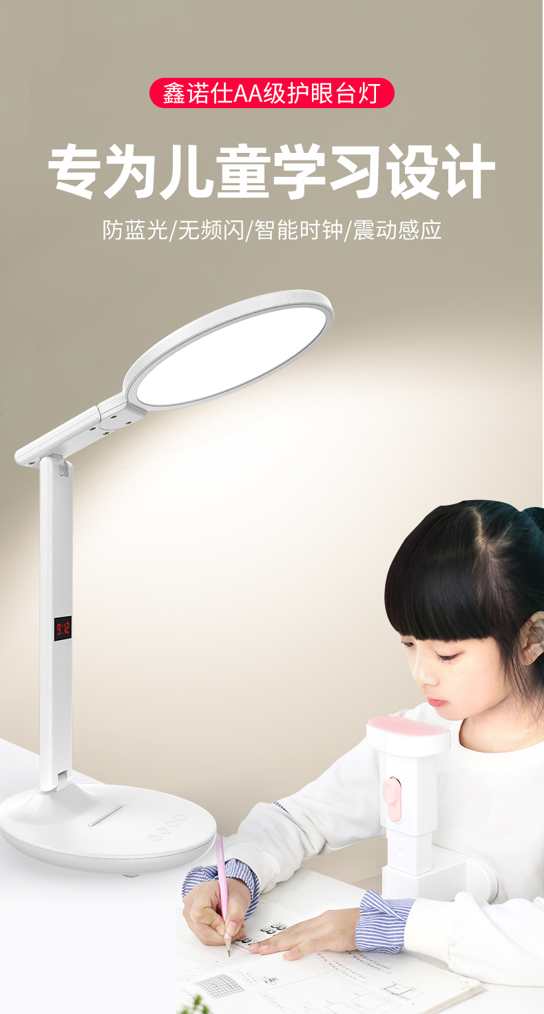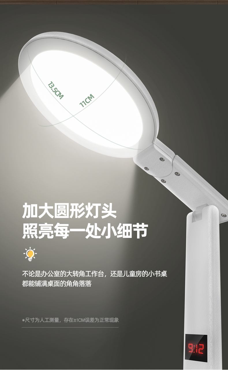 儿童学习灯国AA级照度认证,防蓝光、无可视频闪,加大环形灯头,双效柔光,配合特制导光板,大范围均匀照亮,读写轻松,减轻用眼负担,保护视力。