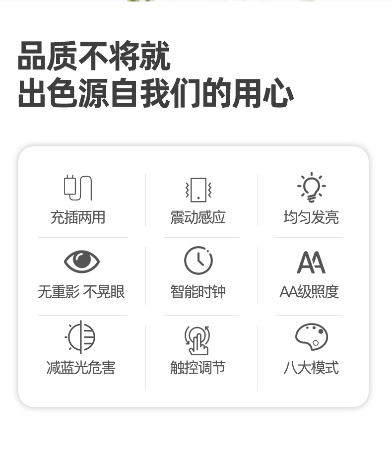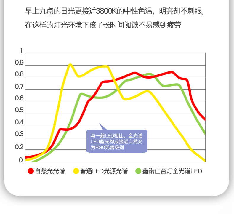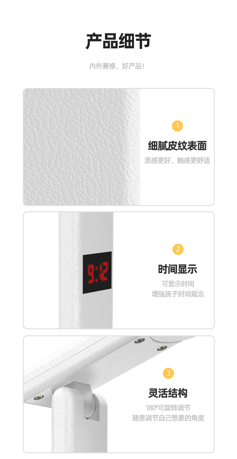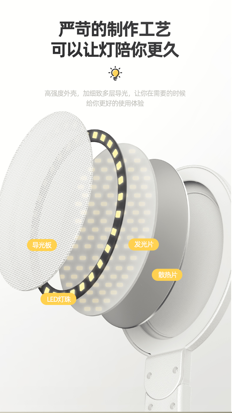 儿童学习灯国AA级照度认证,防蓝光、无可视频闪,加大环形灯头,双效柔光,配合特制导光板,大范围均匀照亮,读写轻松,减轻用眼负担,保护视力。