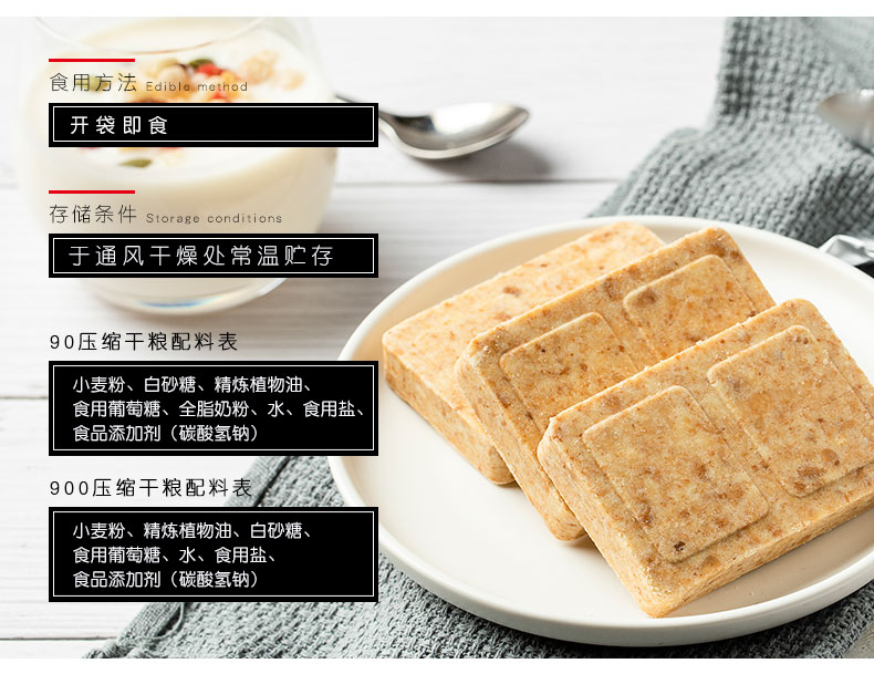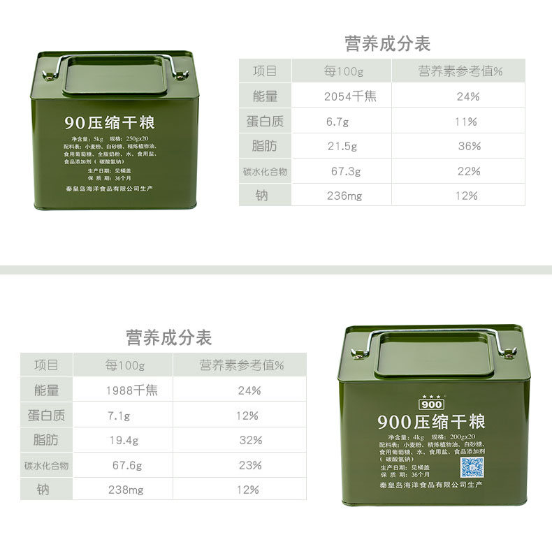 1铁桶20包 每包四小块。精选小麦,精炼植物油,葡萄糖、食用盐等制作,小体积、分量足、能量高;高饱腹高膳食纤维,清香酥脆不硬,营养十足,好吃更健康,常温干燥环境保质期可达3年,可做“战备”物资存储,也适合减肥人士、加班人士、野外出游,应急补充能量,两片横扫饥饿!
