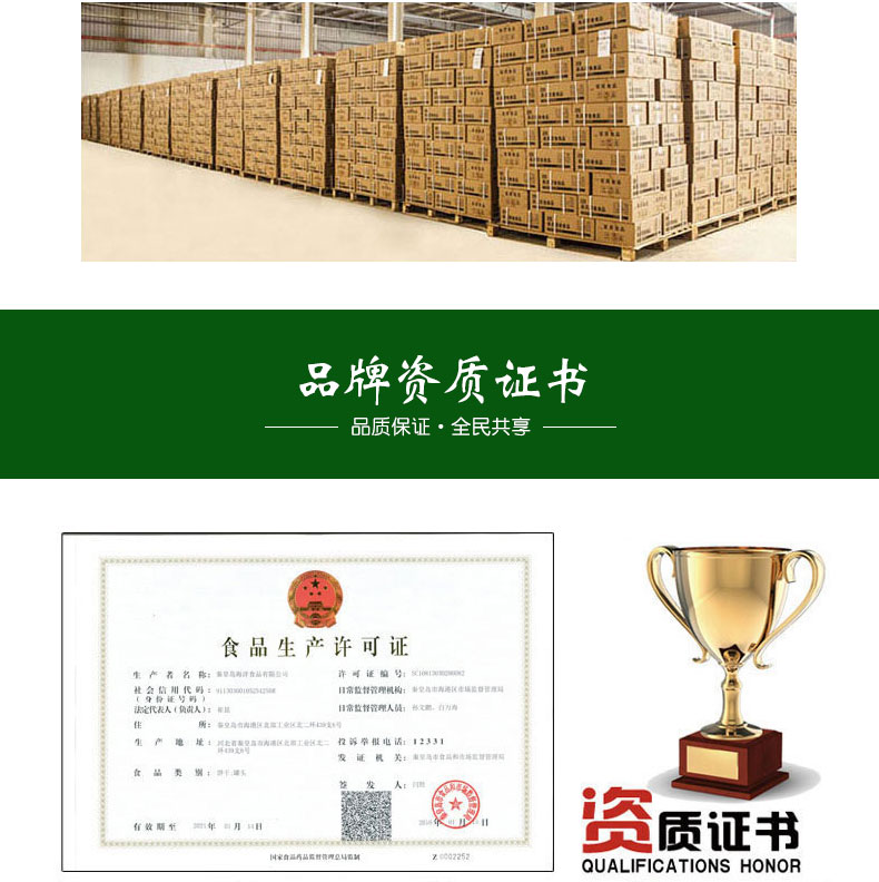 企业建立了完善的质量管理和保证体系,通过ISO9001质量管理体系、ISO22000食品安全管理体系、ISO14001环境管理体系、HACCP关键控制点体系和ISO18000职业健康体系认证,在发展过程中,陆续获得“河北省守合重信用企业”、“河北省名牌产品企业”、“河北省军民融合型企业”、“食品安全示范企业”、“全国消费者公认品牌企业”和“中国优秀诚信企业”等荣誉称号。