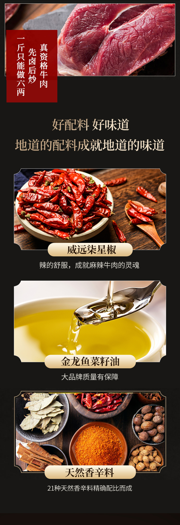 这款江志忠 牛肉干,甄选牛后腿肉和牛腱肉,硬度适中,纹路规则,肉质不碎不粉有嚼劲;不添加防腐剂、色素,经21味天然香辛料卤制而成,色泽红亮、丝丝入味,麻辣鲜美。