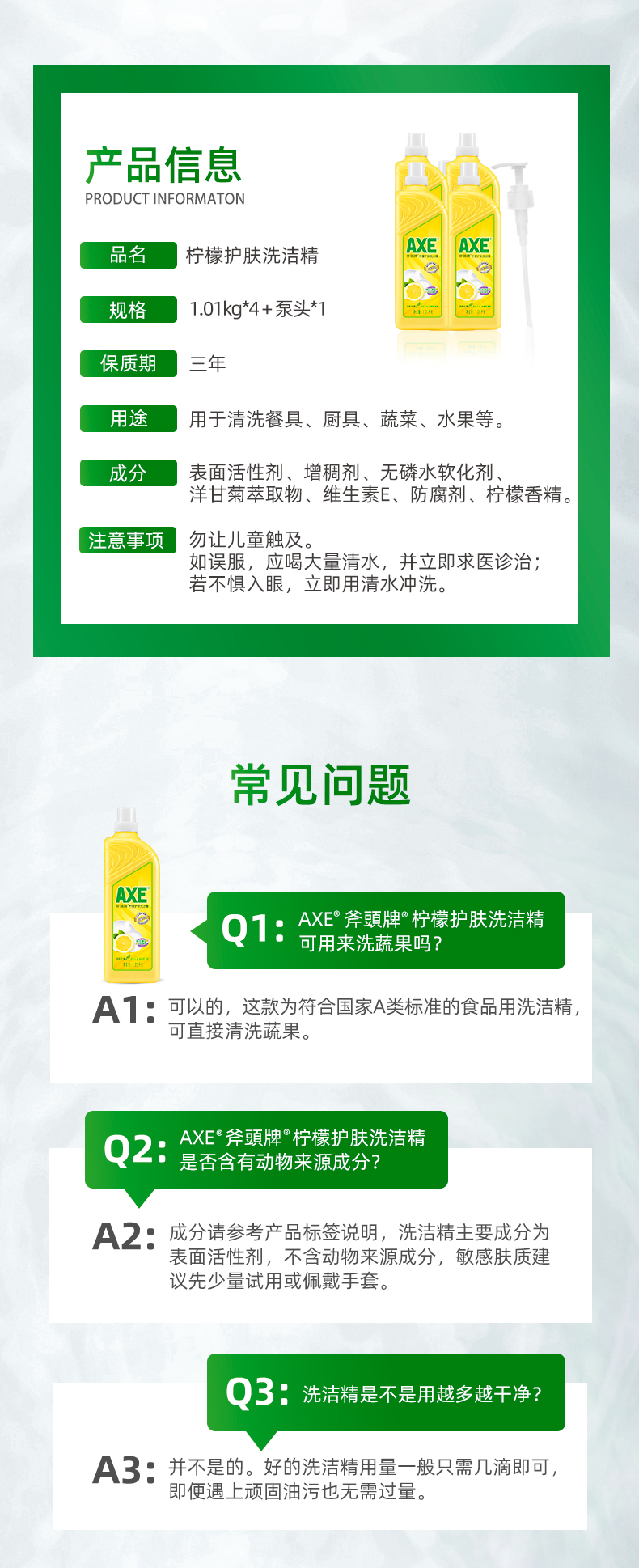 这款AXE 斧头柠檬洗洁精,采用中性配方,蕴含维生素E配方,滋润护肤,不伤皮肤,清洁力比国际高40%,洁净力特强,有效去除多种油污和细菌泡沫适中,过水容易,可用于清洗餐具、厨具、蔬菜、水果等,令碗碟爽洁清新柠檬护肤洗洁精散发清新柠檬香味。