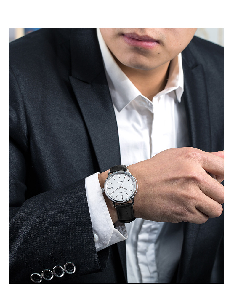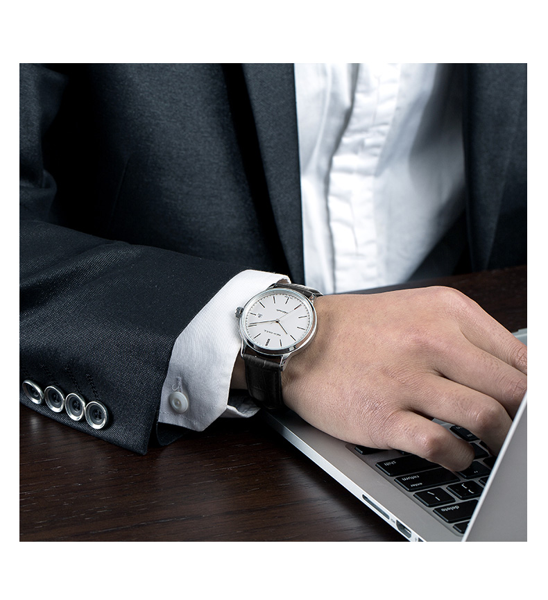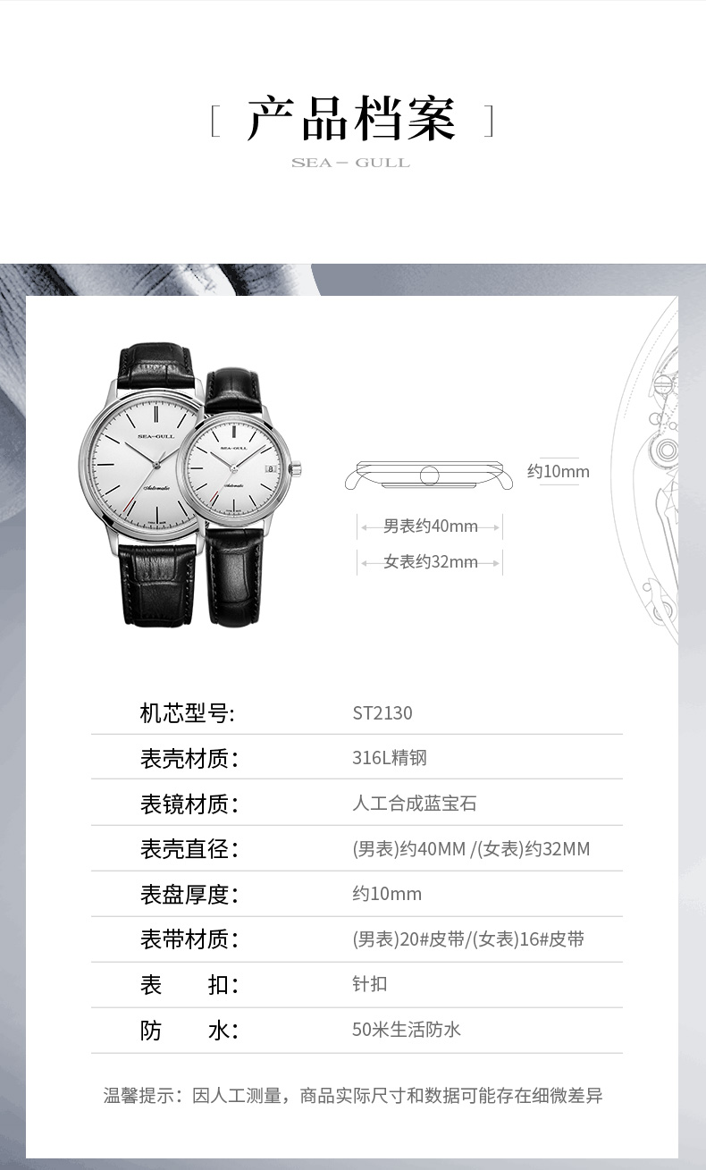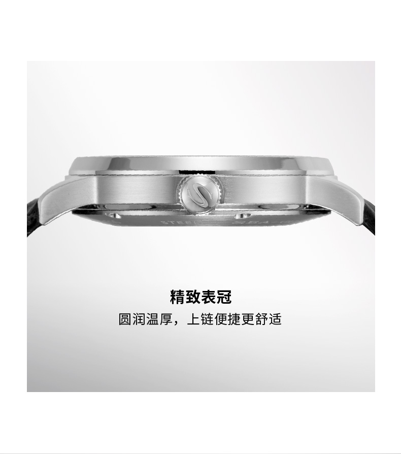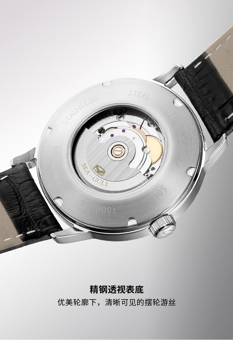 从目前情况来看这款机芯的稳定性、精度都非常不错。316精钢表壳,蓝宝石镜面防刮花,背透看起来更漂亮,白盘蓝针配上黑色真皮表带也是文艺十足。直径38.5MM,不含把头,厚度10mm,防水50米。