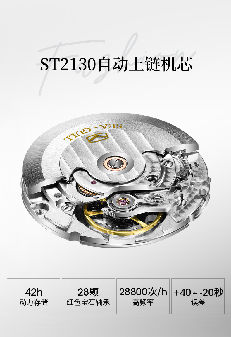 海鸥SEA-GULL是国产腕表品牌里的良心,能做出陀飞轮也是技术能力的表现。这款海鸥 819.368 男款自动机械表采用ST2130机芯、26石、摆频28800次/时,属于海鸥研发的一款单日历机芯,仿制大名鼎鼎的ETA2824。