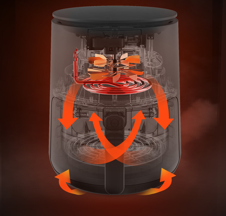 空气炸锅主要是通过空气循环加热锅内空气快速加热和脆化食物,360°无死角热风高转加热使食物受热均匀,外酥里嫩,同时锁住营养和水份,过滤多余油脂。