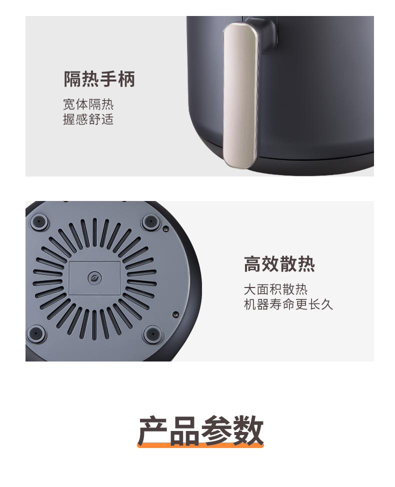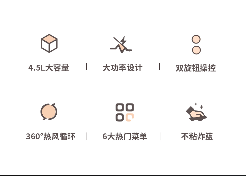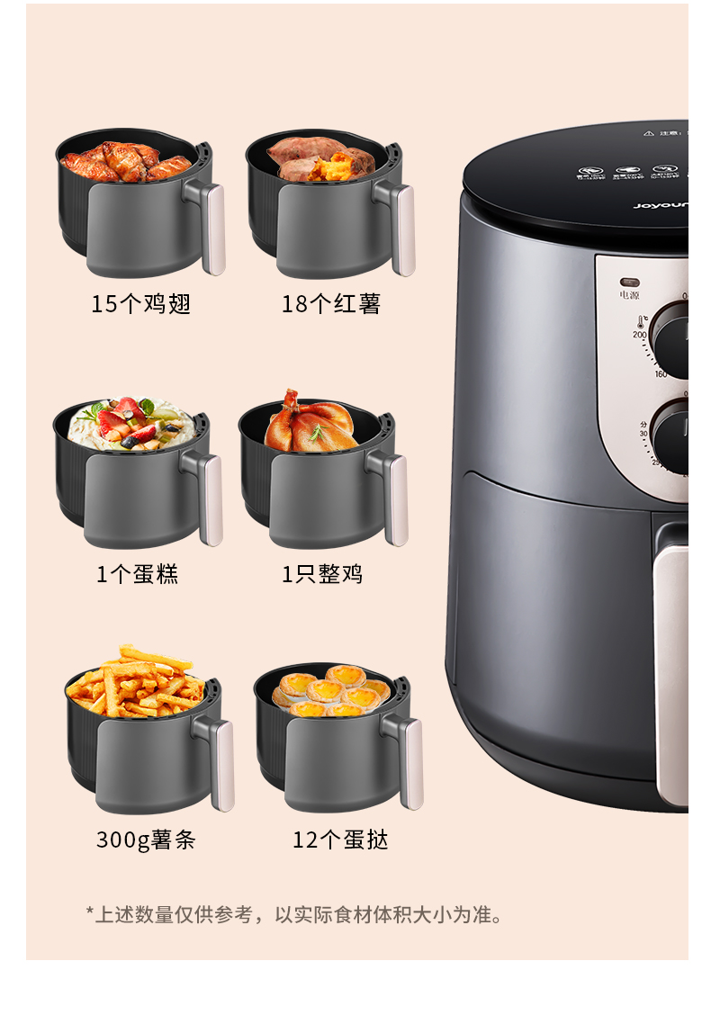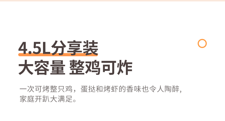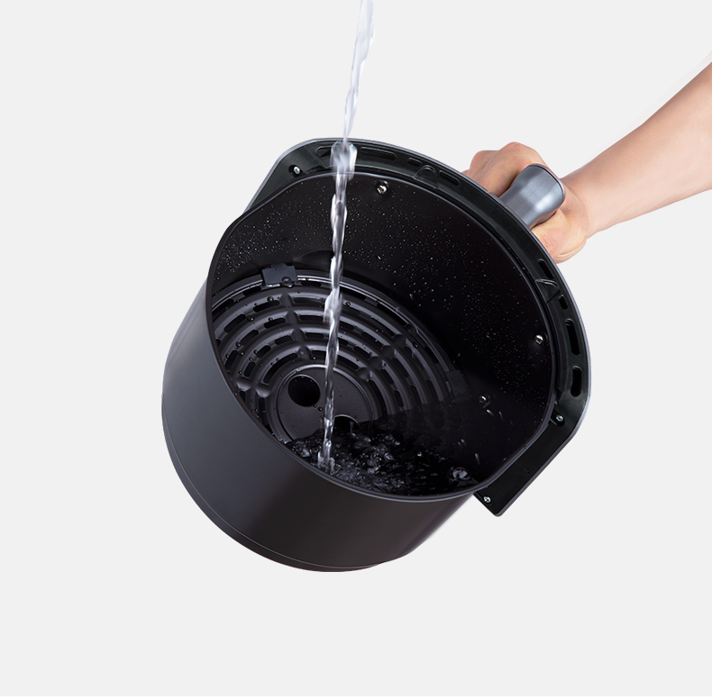 内腔是一体式设计,有不粘油涂层,炸篮和炸锅运用分离技术,按下释放按钮,轻松分离炸蓝和锅底,不粘油更易清洗;锅内容量是3.5L,能满足6-8人可用,一般的空气炸锅只有2L。