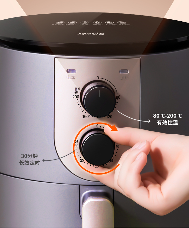 通过旋转齿轮控温,可在0-200℃之间调节,更好的烹饪各式食物,拥有0~30分钟的定时,到时自动停止工作。