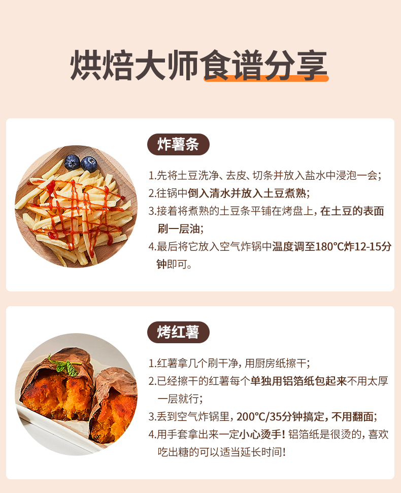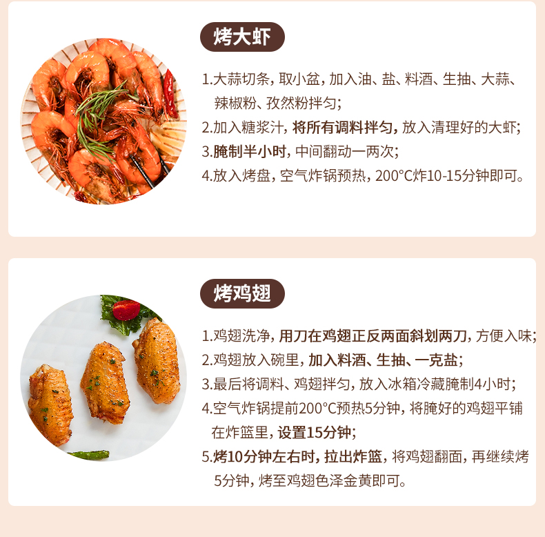 空气炸锅适合烹饪各种肉类、薯条、蛋挞(某宝上可直接买坯子 蛋液)。也可加热买来的外卖熟食,如 披萨、香肠、猪蹄、面包片类之类的,还是很方便的,也是厨房中实用比较高的厨具。