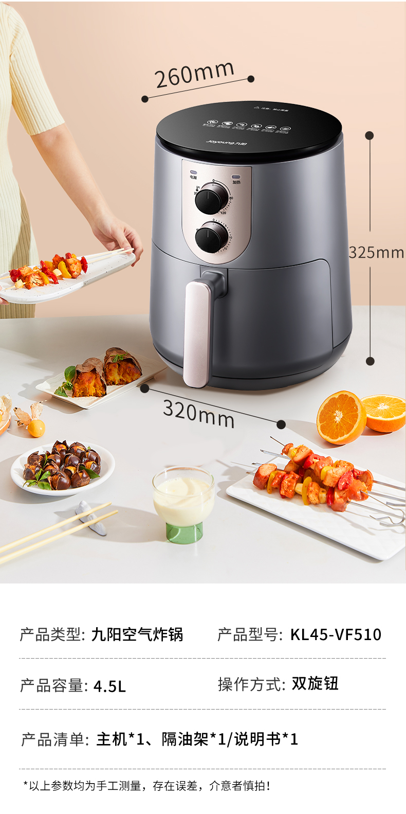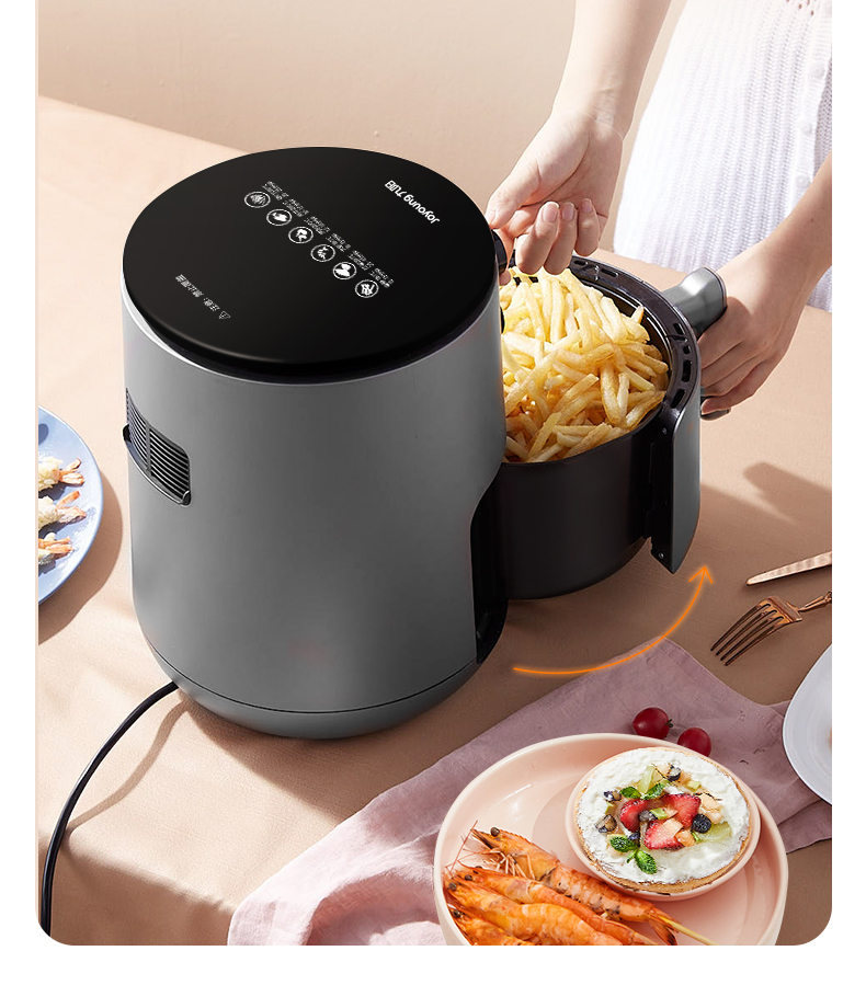 空气炸锅其原理和烤箱类似,通过高速热空气循环,利用食物自身的油脂炸熟食材,相对比传统的油炸更健康,口味也和烧烤的差不多,味道不错。相比烤箱的大体积,空气炸锅更省空间,适合三口之家日常使用,比较实用。