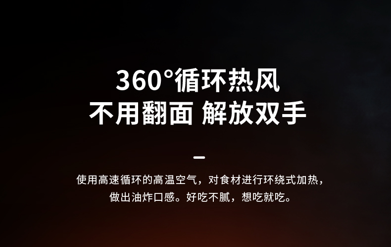这款智能空气炸锅,拥有烧烤、煎炸、烘焙、休闲四种模式,通过顶部与锅底的发热装置,快速加热锅内的空气,在大功率的风扇作用下,极速循环锅内热空气、快速的加热和脆化食材,无需加油。