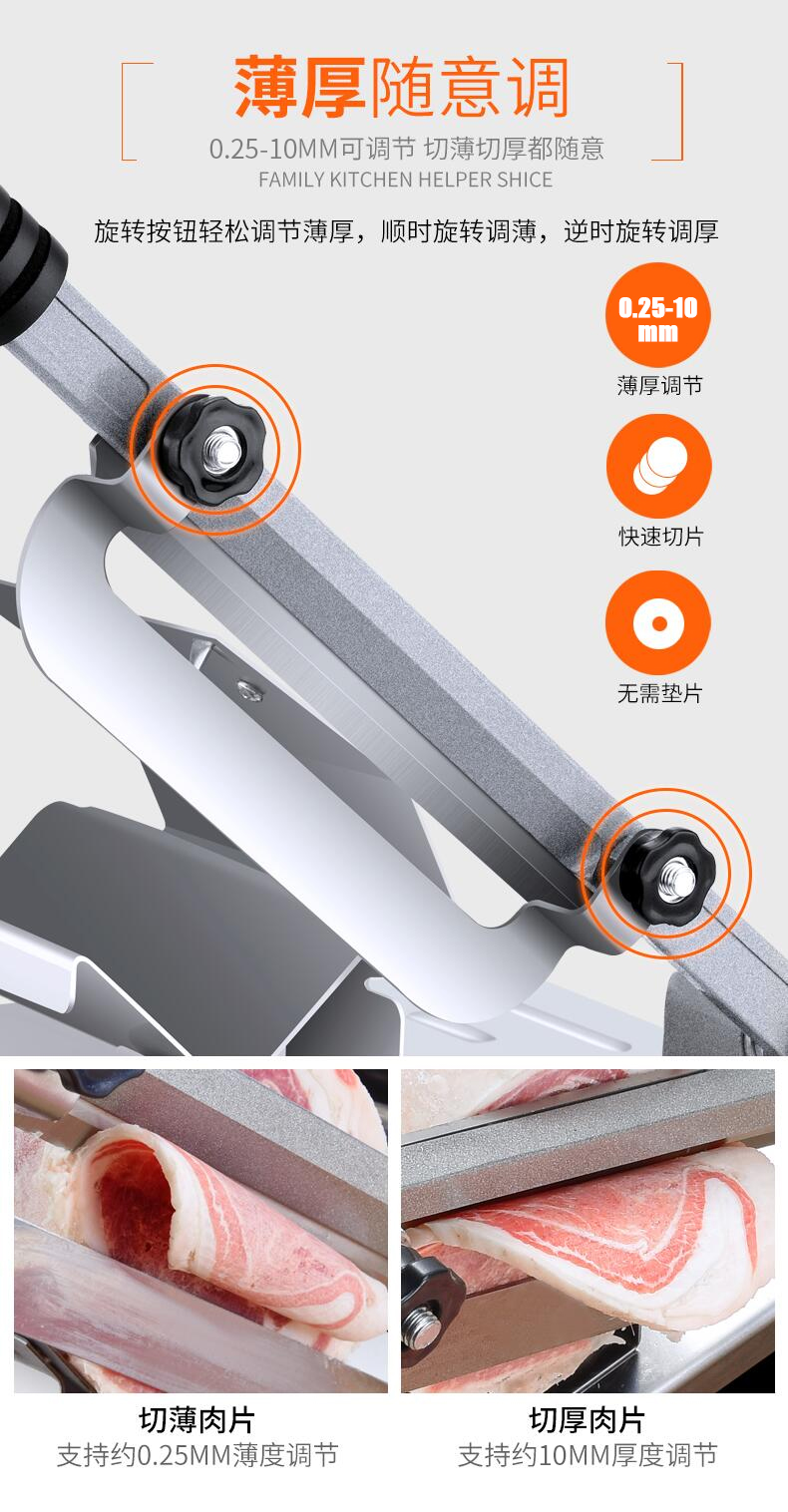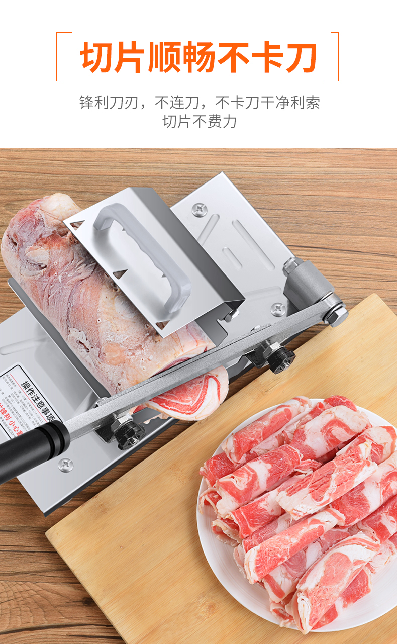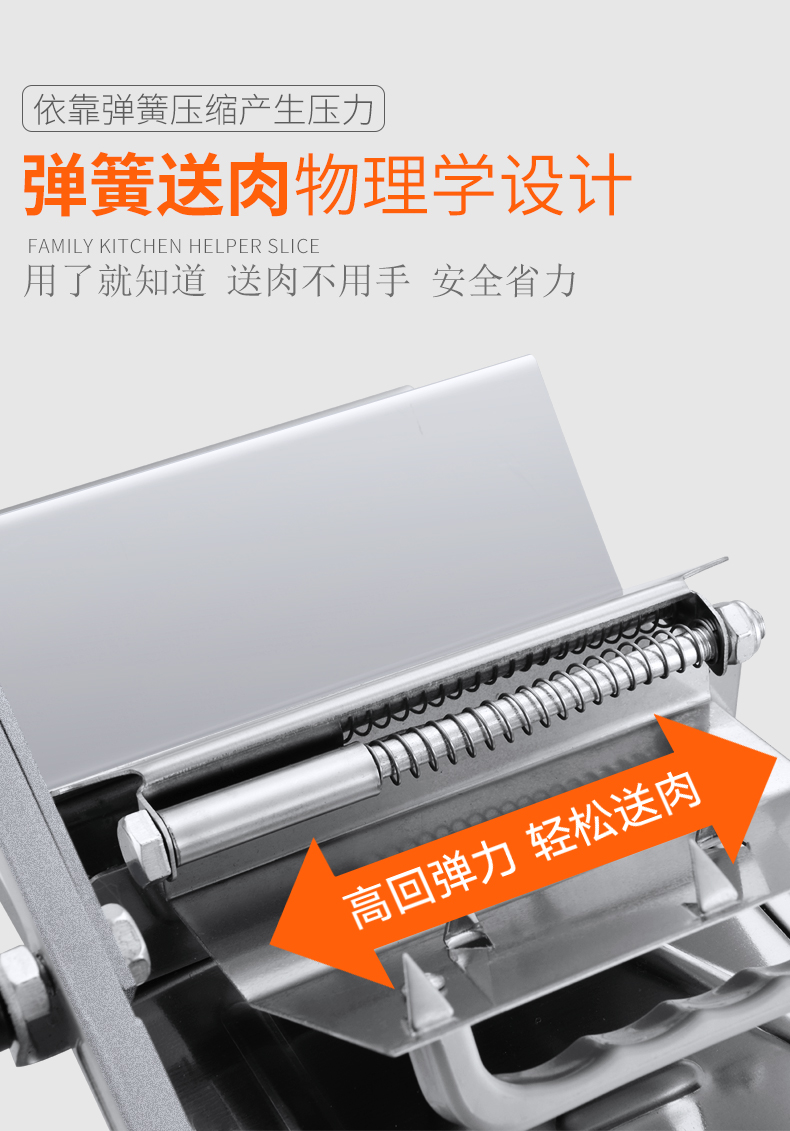 这款微力切片机受力处均为优质不锈钢制作,坚固耐用,切片省力,底部有高回弹弹簧,送肉安全省力,刀片可在0.3mm-8mm之间调节,可按照自己喜好切厚薄,单次打磨可连续切上百斤冻肉,刀片可持续打磨5次,中部V型托架,向下按压不变形,坚固固定不滑动。