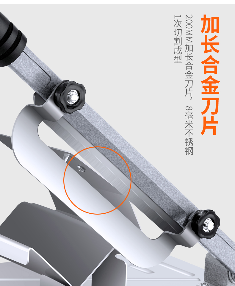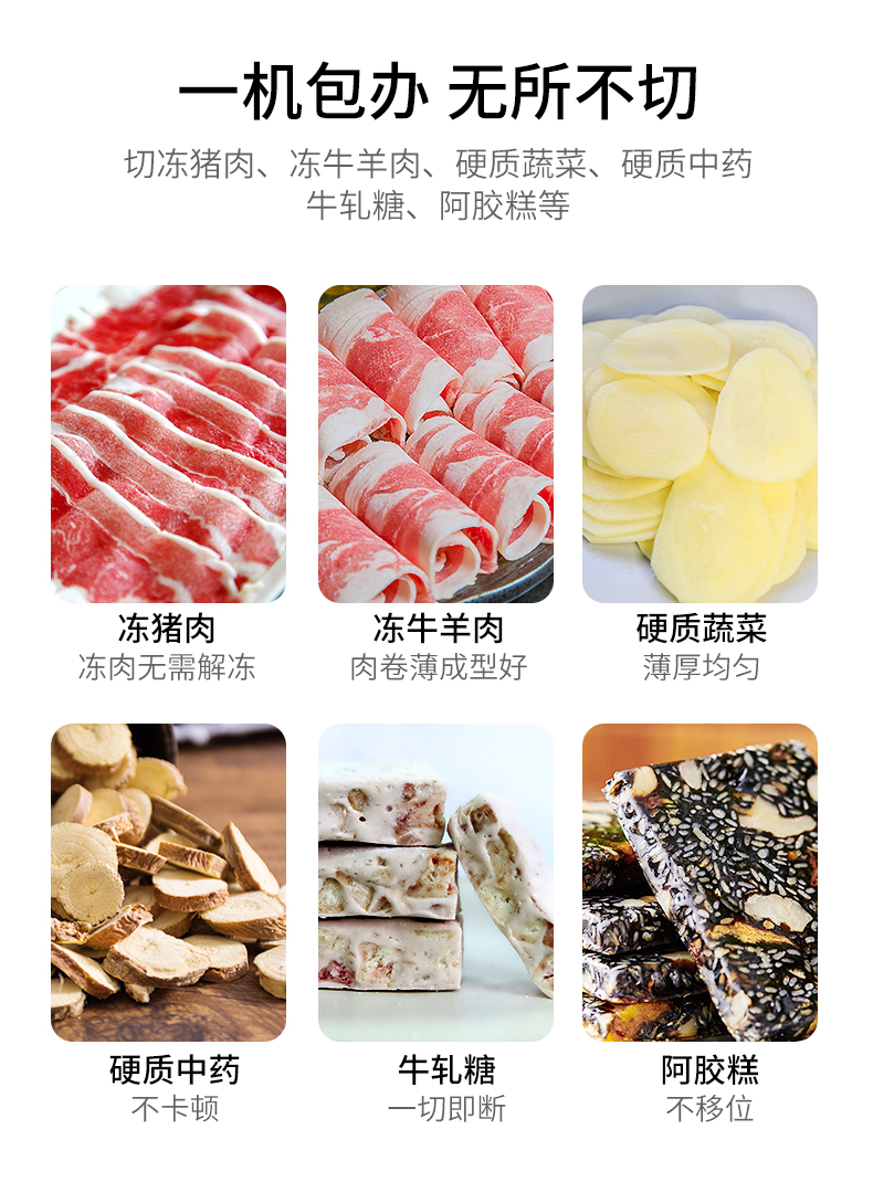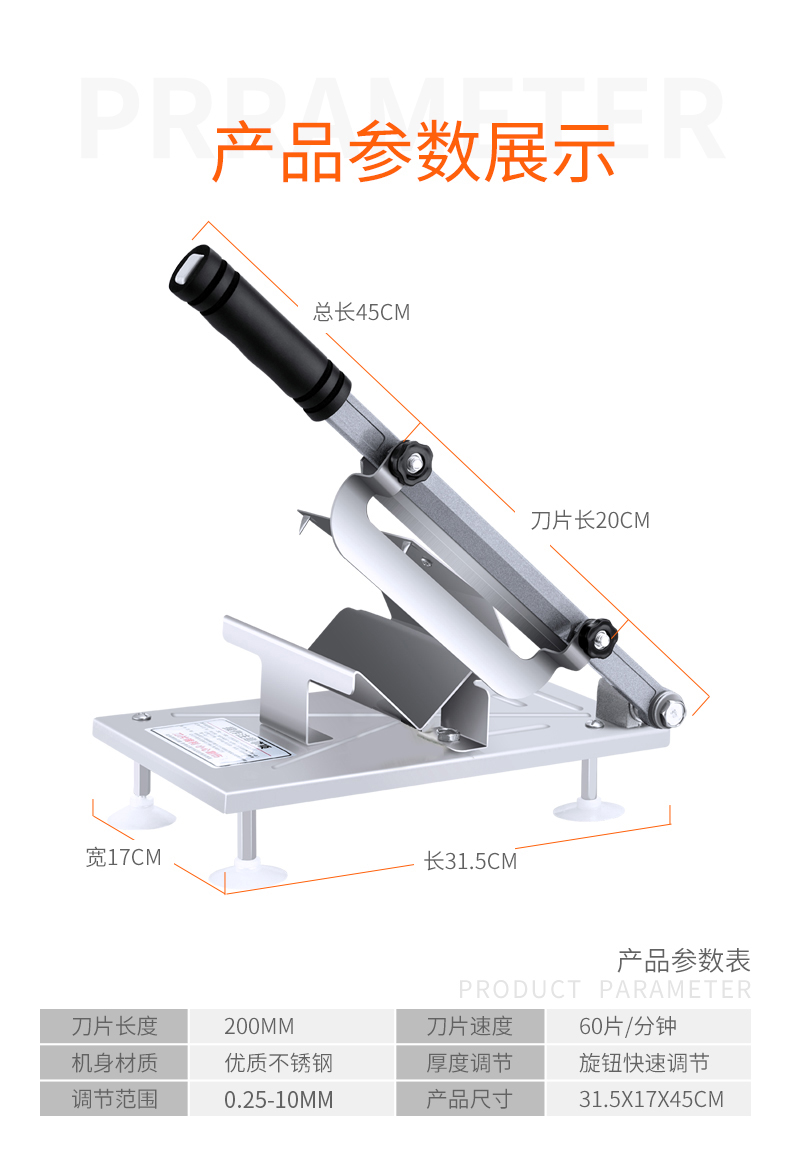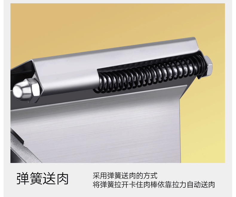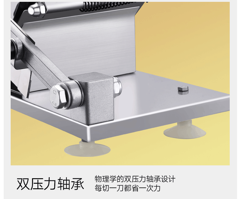 这款微力切片机受力处均为优质不锈钢制作,坚固耐用,切片省力,底部有高回弹弹簧,送肉安全省力,刀片可在0.3mm-8mm之间调节,可按照自己喜好切厚薄,单次打磨可连续切上百斤冻肉,刀片可持续打磨5次,中部V型托架,向下按压不变形,坚固固定不滑动。