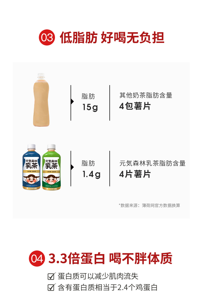 同时乳茶里蛋白含量高达8.5g,比国家标准多73%,根据乳粉和蛋白质换算含有不少于58.7%的牛奶含量,是其他瓶装奶茶的6倍。更没有防腐剂、植脂末、添加剂、反式脂肪酸的添加,配料简单干净。