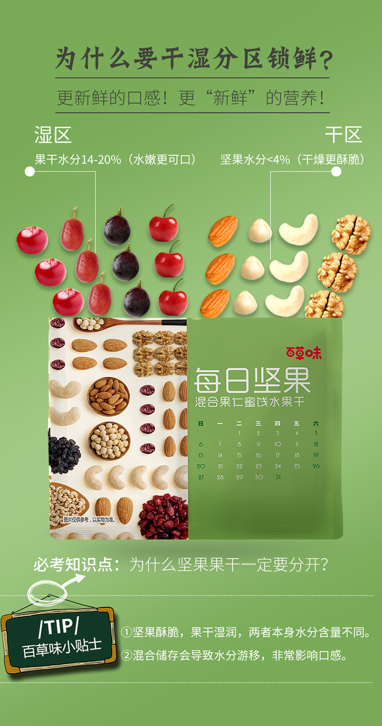 专利分区锁鲜,坚果水分<4%、果干水分14-20%,坚果酥脆。果干鲜嫩,口感更佳是名副其实的高端款。规格:25g*30袋 礼盒装,自用送人都适合。