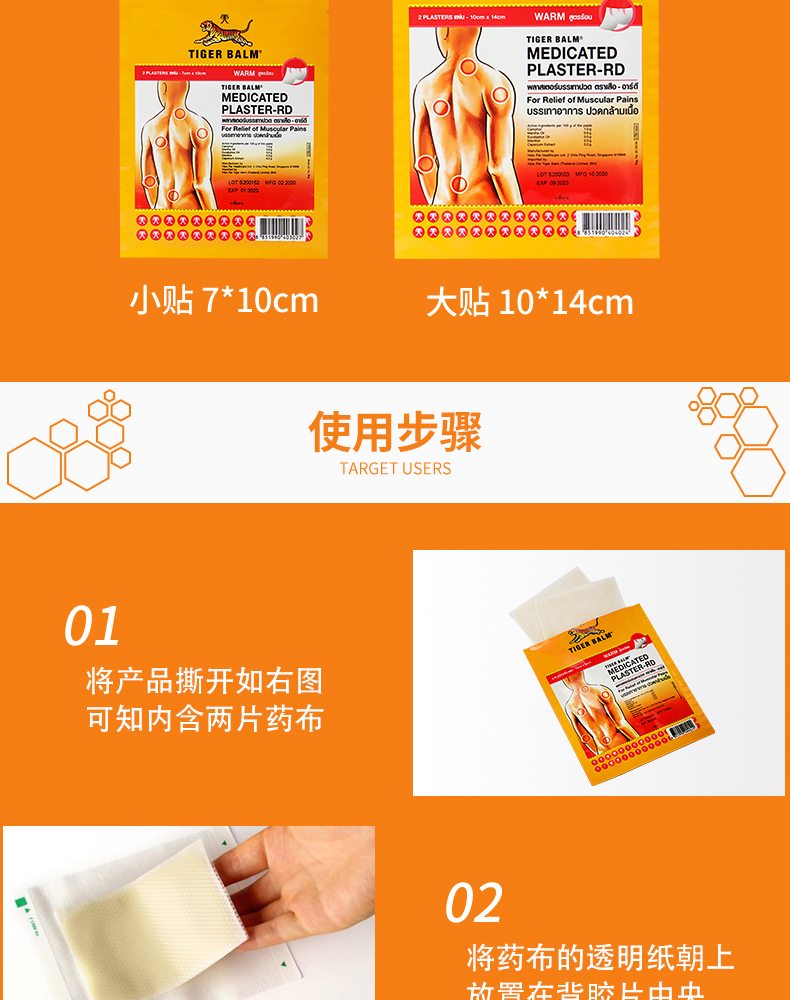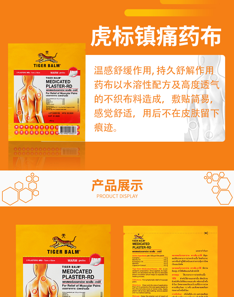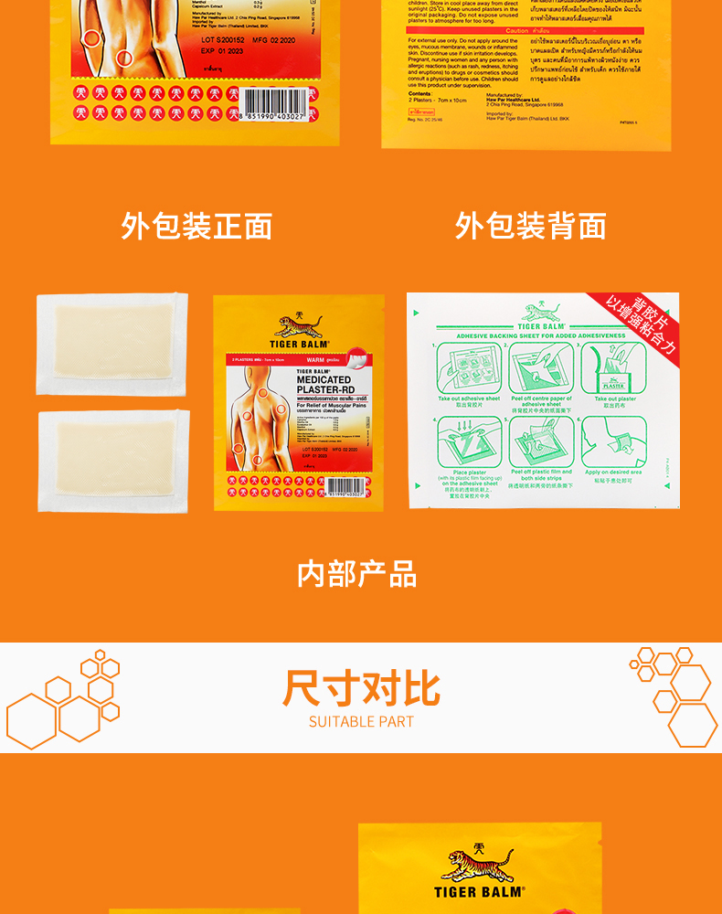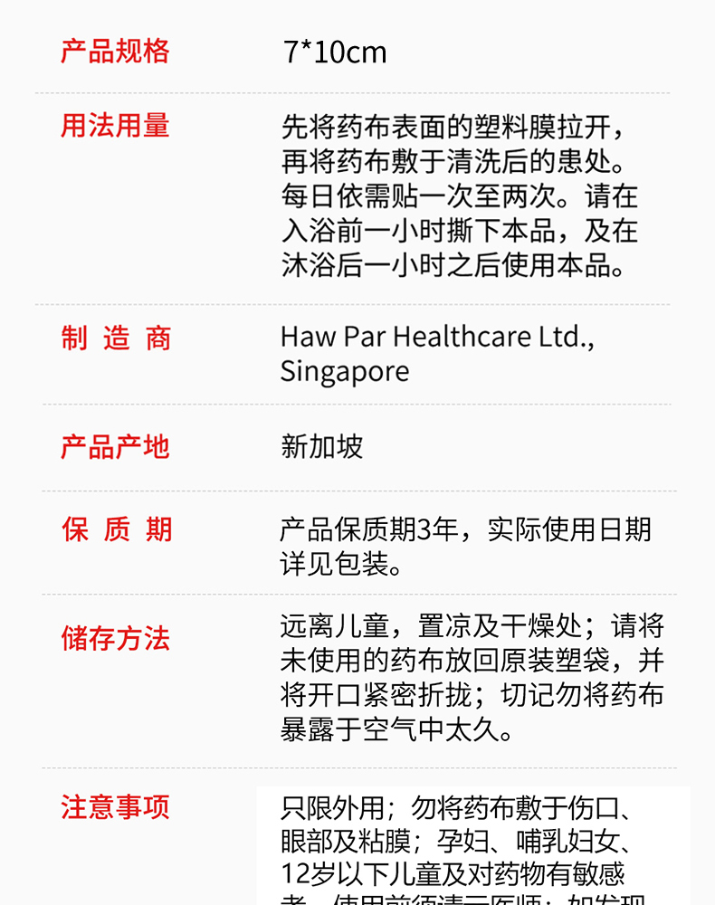虎标贴膏,一共有两款,一款是红色温热型,一款是绿色清凉型,除了体感不一样外,效果都是一样的,因为红色的有温热的感觉,如果皮肤敏感的就选择绿色。如果有四肢关节疼痛,颈部、腰部以及腰椎间盘突出,坐骨神经疼、腰椎压迫神经等引起的疼痛都可以用这款膏贴来改善,能很好的改善关节疼痛麻木,跌打扭伤等还有软组织损伤等疾病。