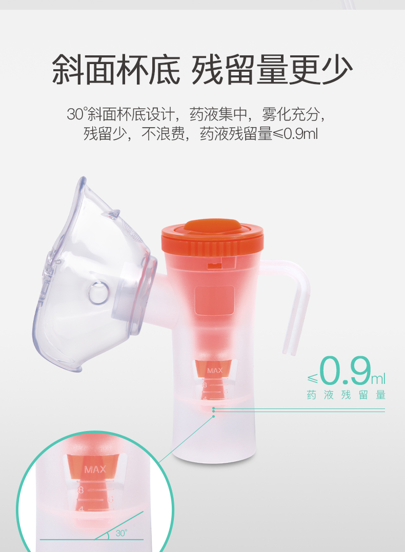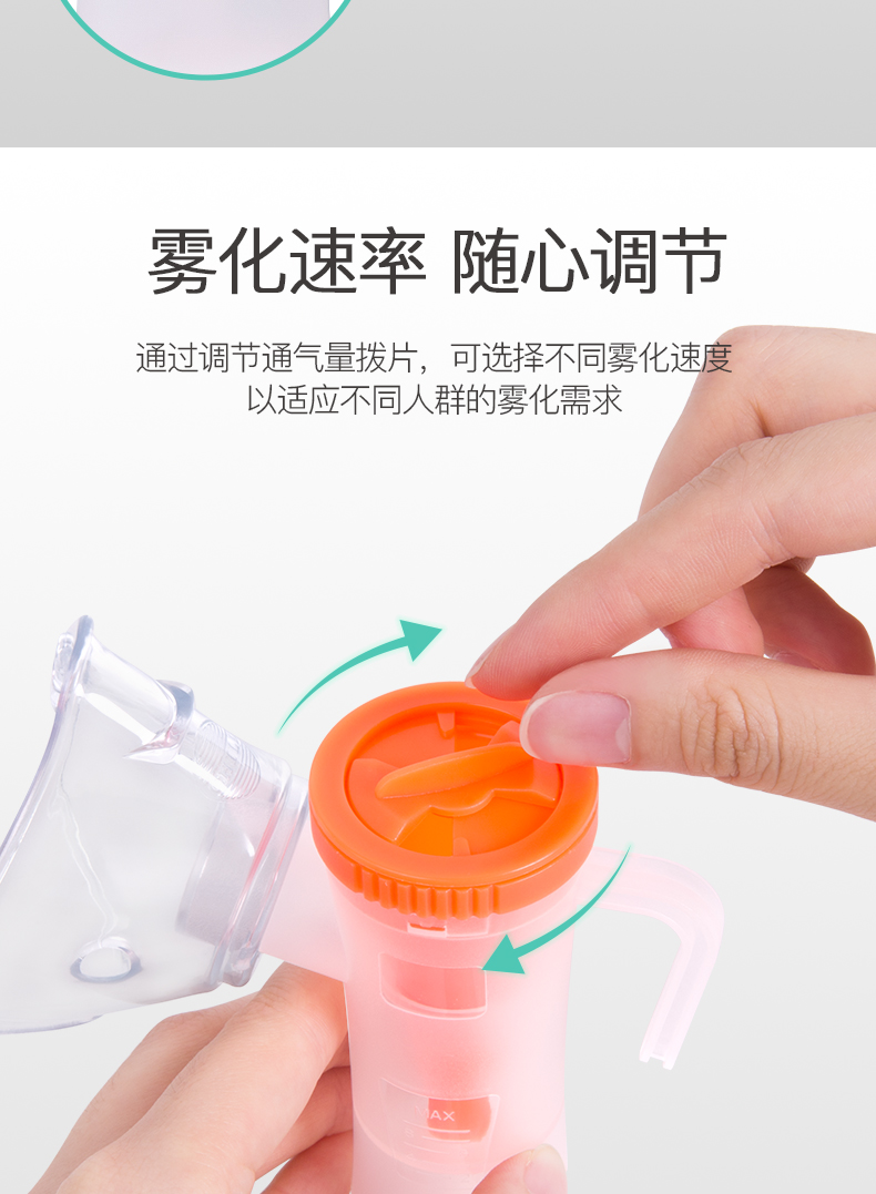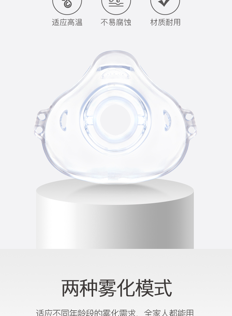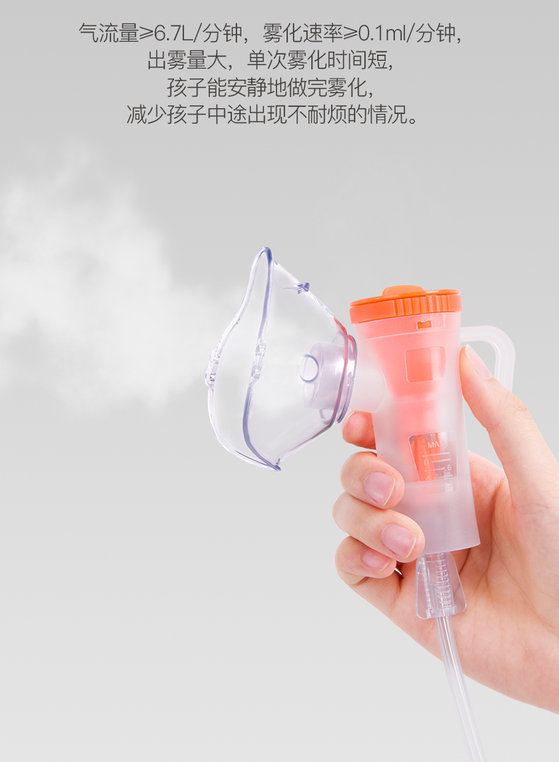 平均雾化颗粒小于等于5微米,雾化速率≥0.1ml/min,雾化速率随心可调,面罩、口含式2种吸入使用不同年龄段使用,标准医用级硅胶材质,不含塑化剂等有药物质,耐高温耐腐蚀,健康有保障。