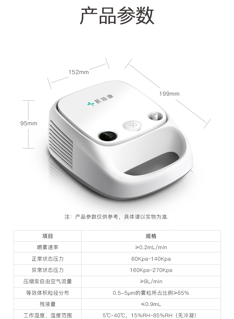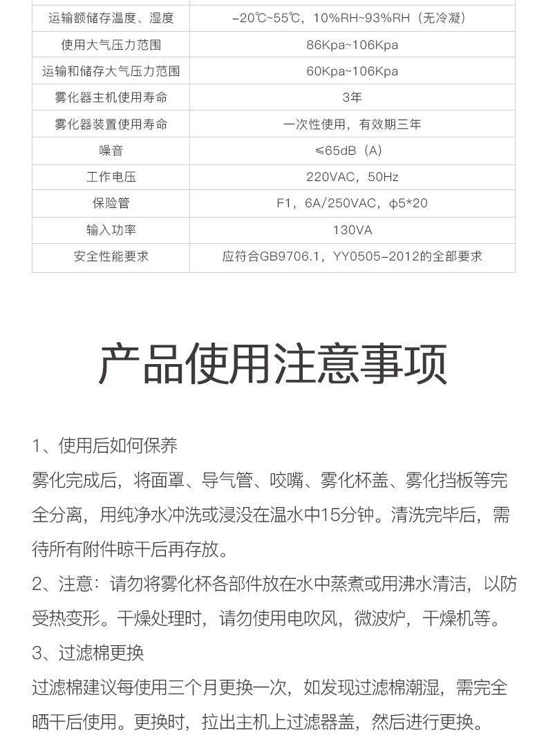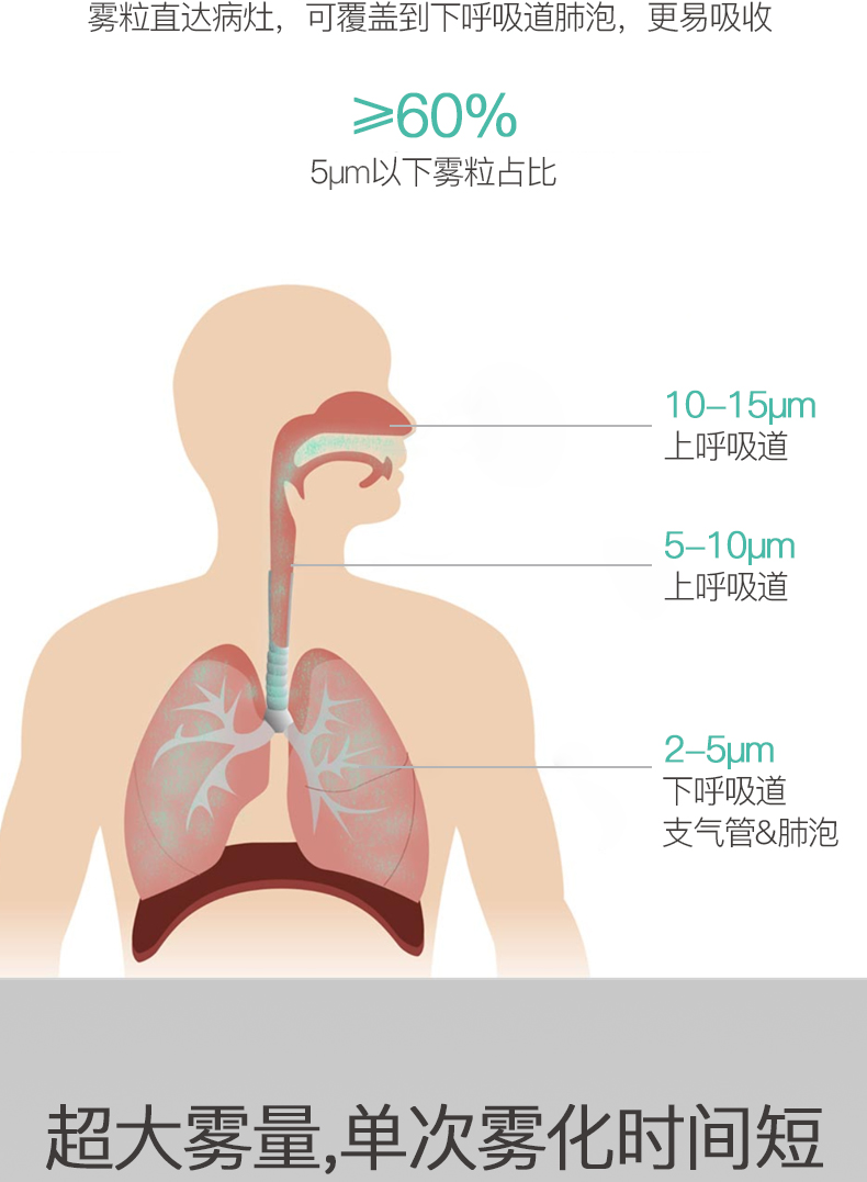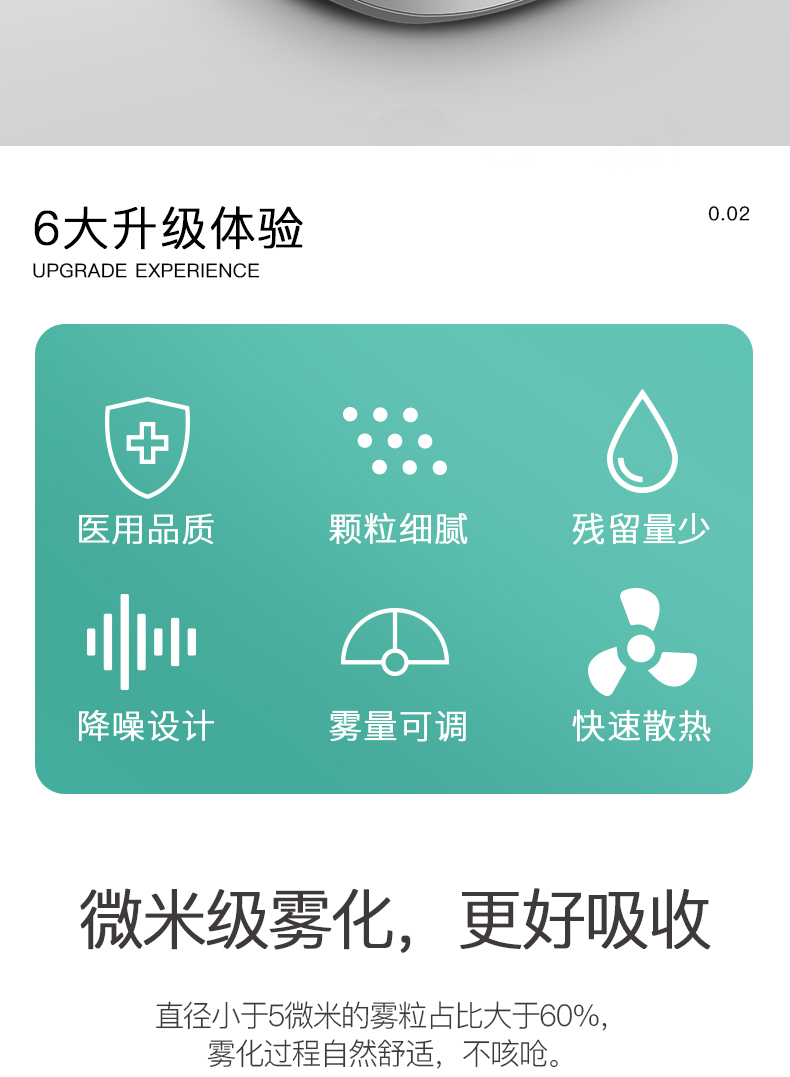 平均雾化颗粒小于等于5微米,雾化速率≥0.1ml/min,雾化速率随心可调,面罩、口含式2种吸入使用不同年龄段使用,标准医用级硅胶材质,不含塑化剂等有药物质,耐高温耐腐蚀,健康有保障。