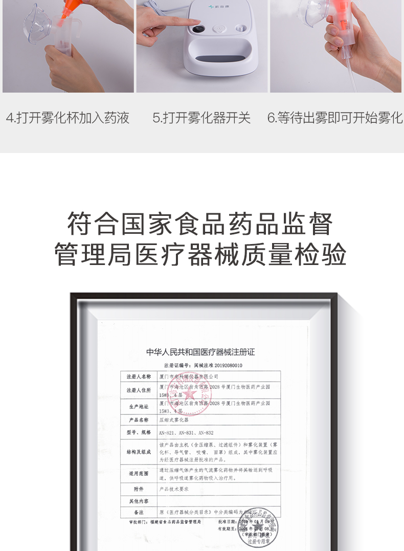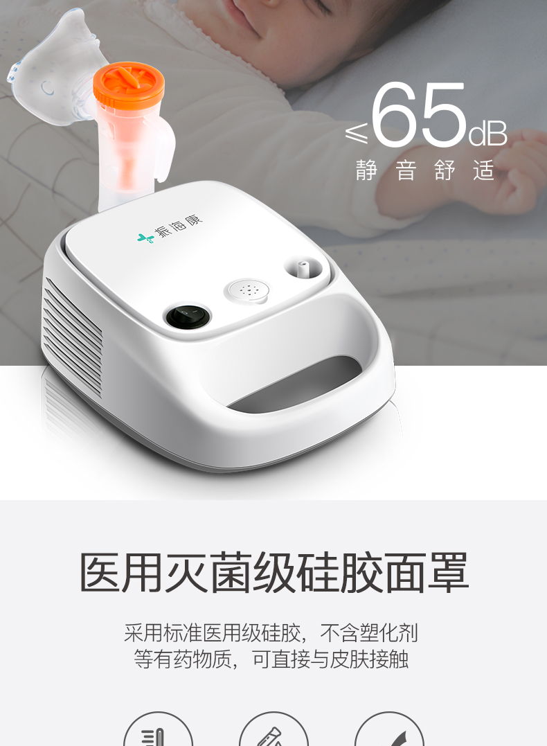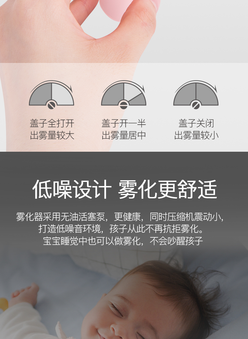 这款雾化器,成人儿童均可使用,医用级品质,采用无油活塞泵,颗粒细腻、噪音低、残留量小、雾量可调,符合国家食品药品监督管理局医疗器械质量检验。宝宝睡觉中也可做雾化,不会吵醒孩子。