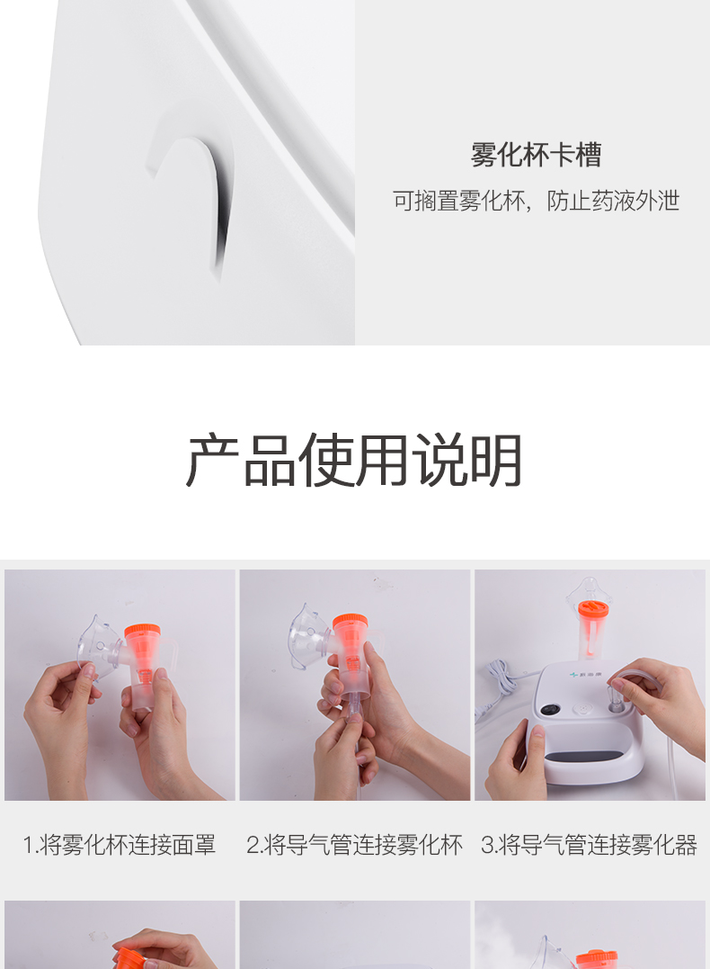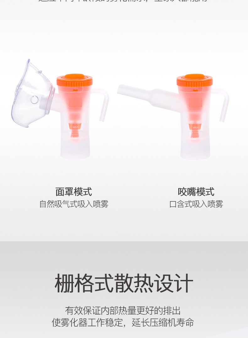 压缩雾化器:是利用压缩机把通过抗菌网棉基滤过的洁净空气压缩为一股强大的气流,由喷气口喷出,冲击药水杯内的液体,将其药水气化,再由出雾口喷出来,供口鼻吸入,由于药物颗粒微细,雾化成直径1-5微米之间,容易通过呼吸深入到肺、支气管血管部位,且用药量少,适合人体直接吸收,提高疗效,加快疗效,使用寿命长。