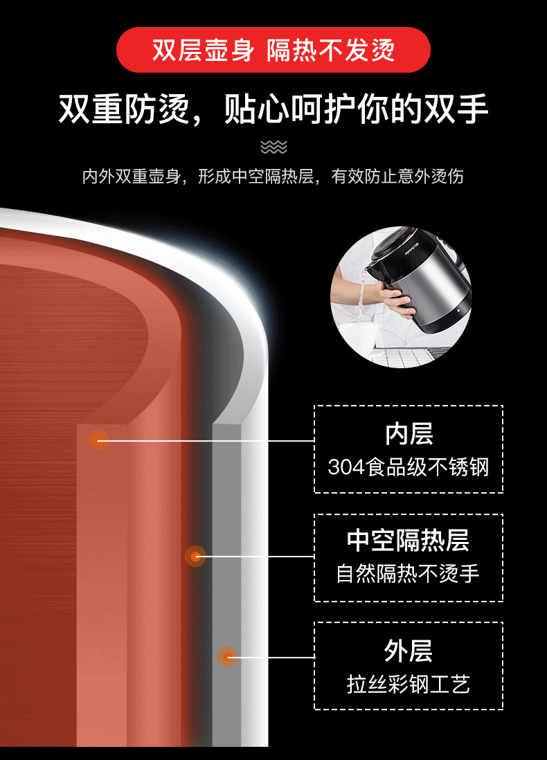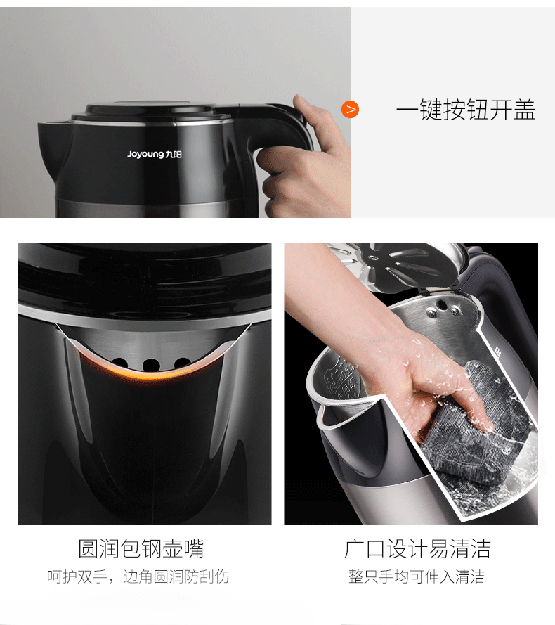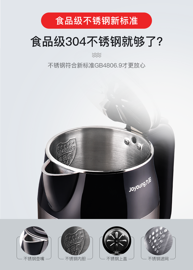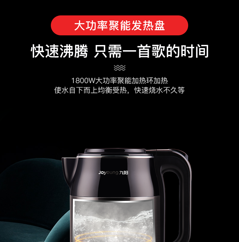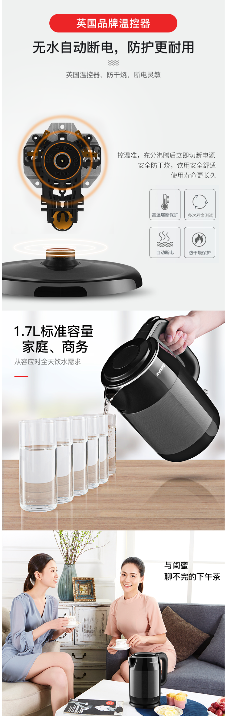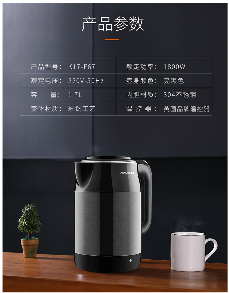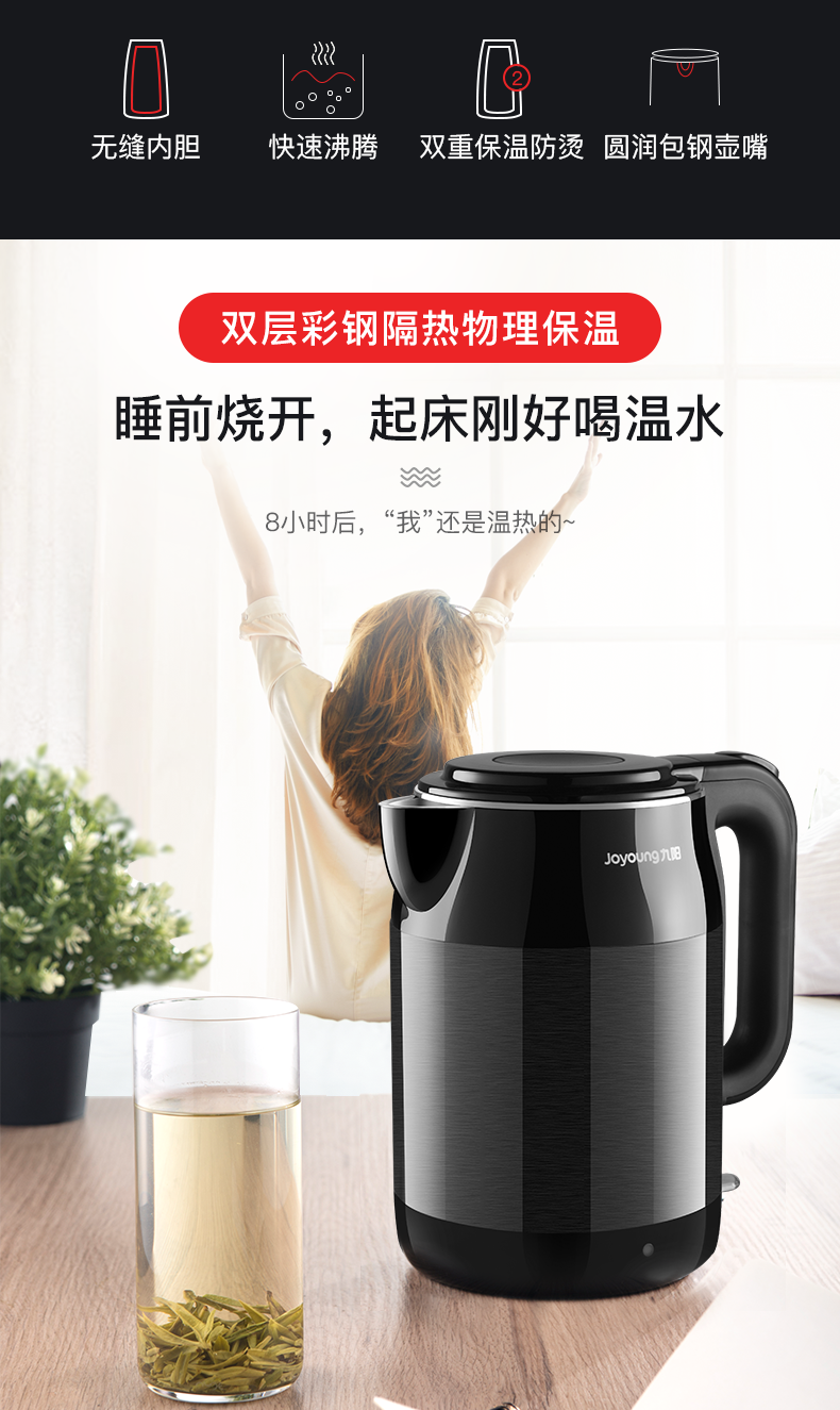 这款九阳电热水壶,采用外层彩钢和内层304不锈钢材质工艺,双层隔热不烫手,保温效果非常好。1800W聚能大功率加热,升温迅速,1.7L大容量,家用办公室使用都不错。无缝一体成型内胆,不易生锈,清洁方便,英国Strix温控精准控温,防干烧。