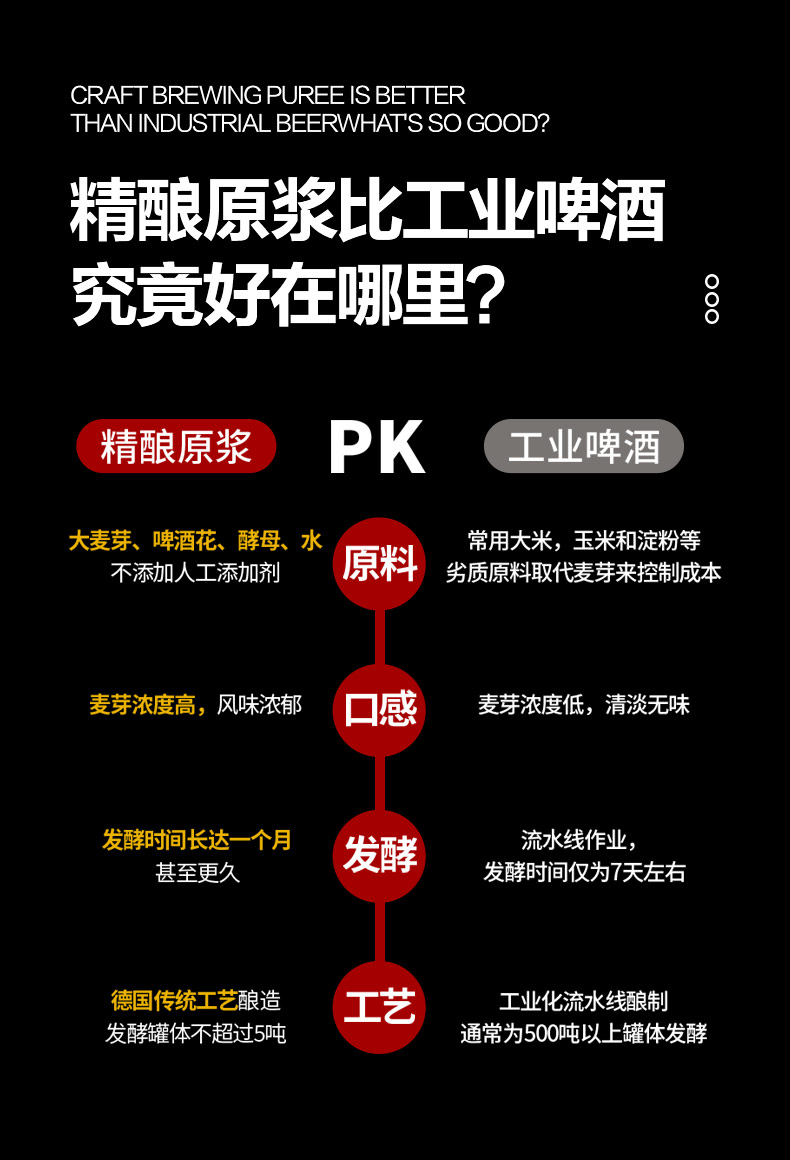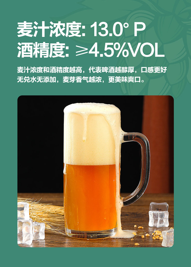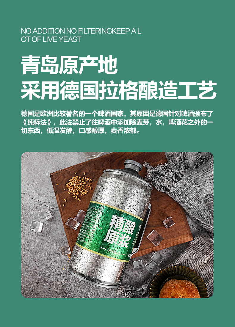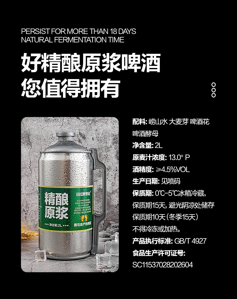 青岛原产地原浆精酿,采用德国拉格酿造工艺,坚持18天以上低温发酵,酒精度数≥4.5%vol,麦汁浓度13.0°P,无兑水无添加,泡沫细腻持久挂杯,麦芽香气浓郁,好喝不上头。