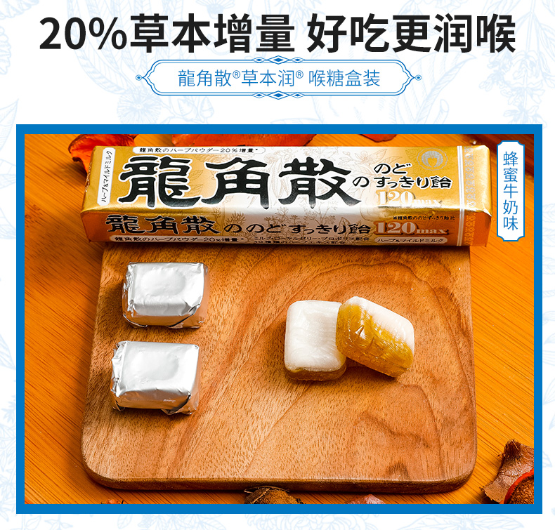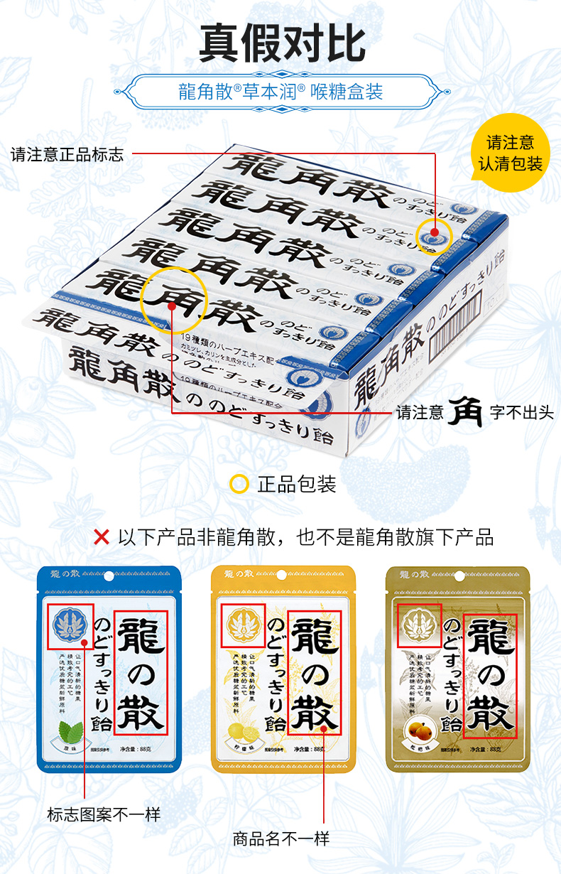 特别的龙角散生药配合,100微米细的龙角散粉末包覆于润喉糖的中心,瞬间滋润不适喉咙,对于除痰止咳,清肺、痰多,咽喉肿痛、咽喉炎症有一定的功效,特别是换季的时候,早晚温差大,容易引起长久的干咳和痰咳,家中常备药品,3岁以上宝宝都可以吃。