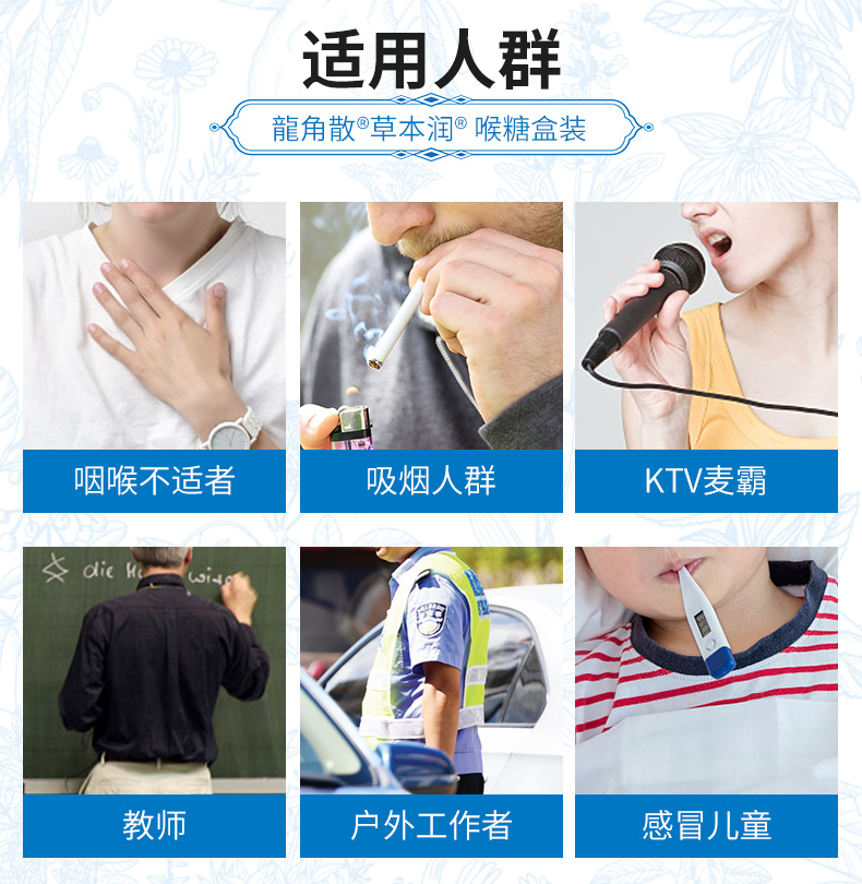 对于感冒引起的喉咙肿痛及吸烟过多导致的嗓子不适,都有显著缓和作用,适用于咽喉不适者、吸烟人群、感冒儿童、教师、户外工作者、KTV麦霸等。