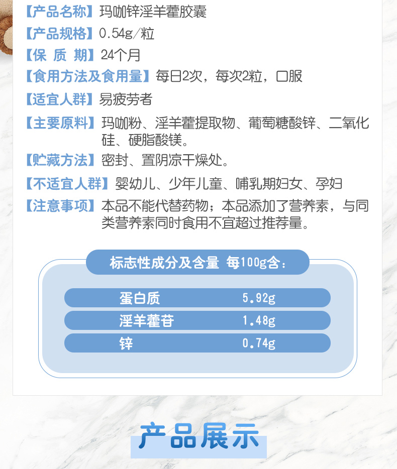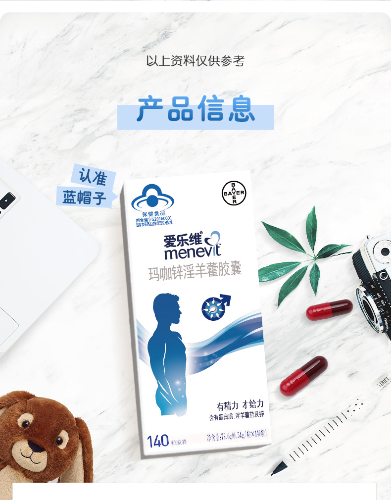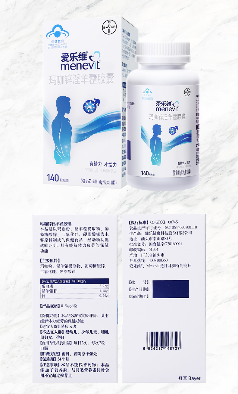 这款爱乐维玛咖锌淫羊藿胶囊是专为男性设计,是以玛咖粉、淫羊藿提取物、葡萄糖酸锌、二氧化硅为主要原料制成的保健品,具有缓解体力疲劳,提高精子活力的效果。规格是140粒/瓶,用法用量:1日2次,1次2片。