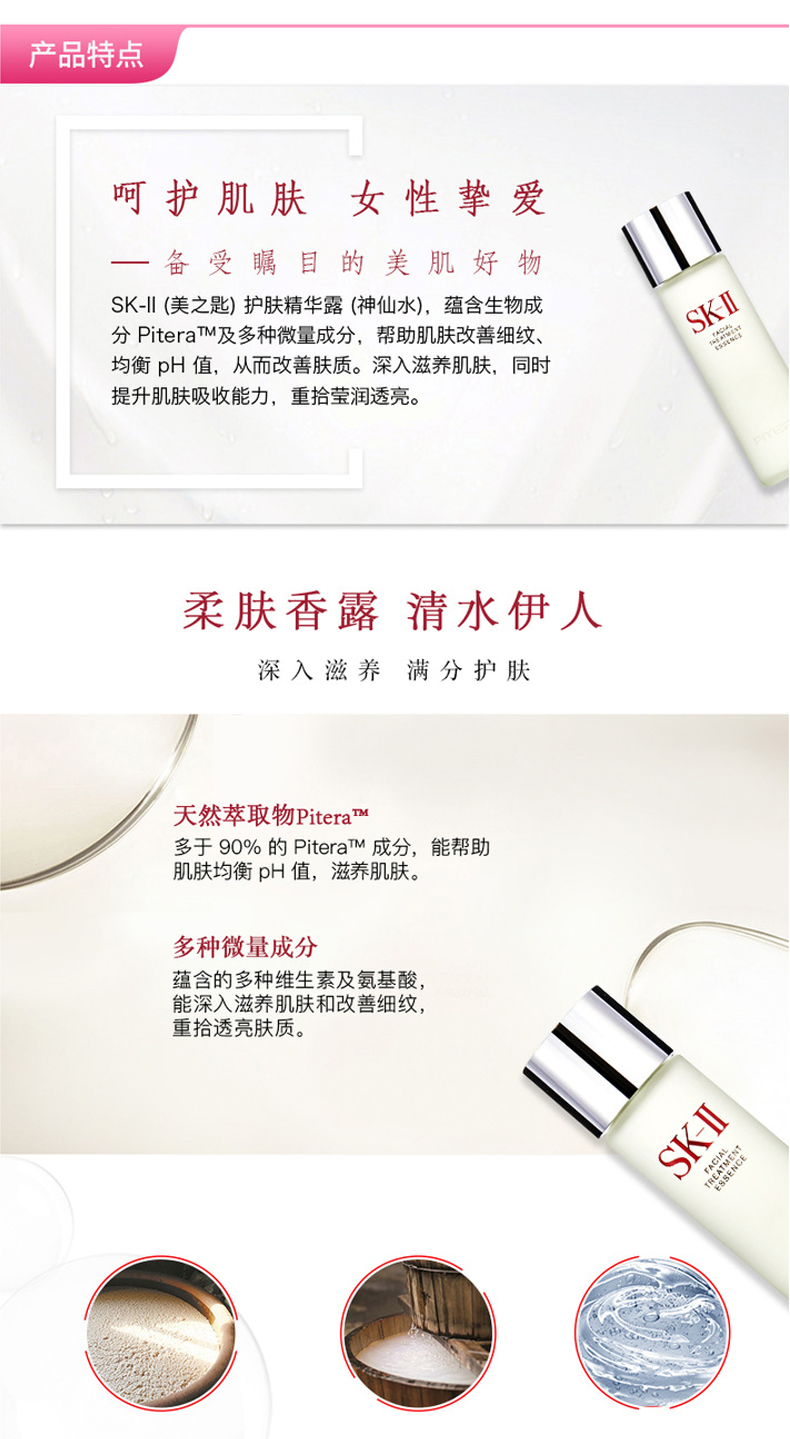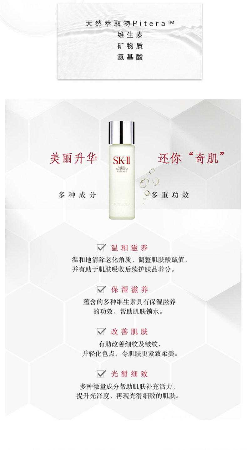 SK-II神仙水含有高达90%以上的富含多种营养成分的PiteraTM酵母精华。每天为肌肤提供充足营养并调理肌肤,深层保湿,平衡肌肤的pH值,塑造润泽光洁的肌肤本色。 PiteraTM提升五大美肌维度,让肌肤升华至晶莹剔透: