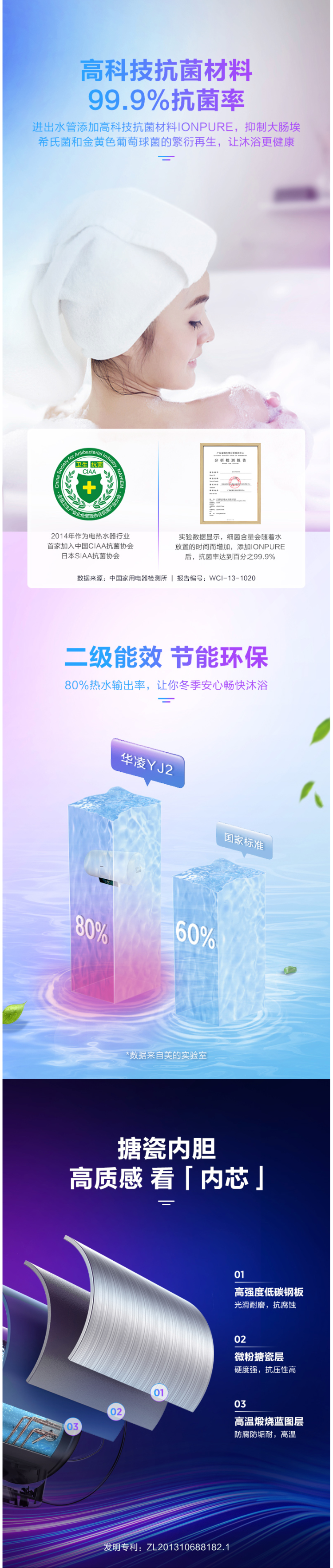 首先是5倍热水增容,热水器容积不变,用水量翻了5倍;抑菌洗浴功能,99.9%抗菌率,进出水管添加高科技抗菌材料IONPURE,抑制大肠埃希氏菌和金黄色葡萄球菌的繁衍再生,过滤细菌杂质,确保出水洁净。