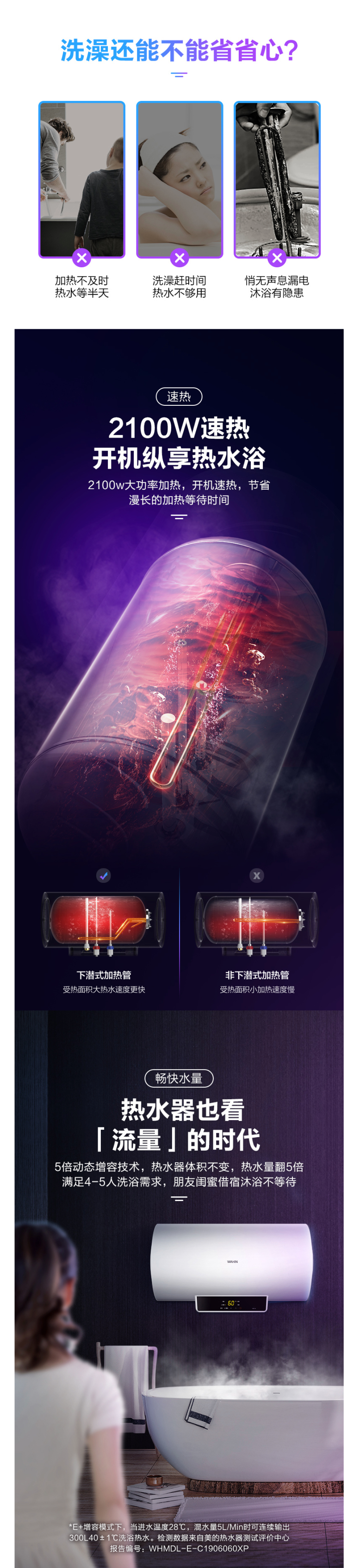 功率是常规的2100W速热,可远程遥控、抑菌洗浴、六重保护。