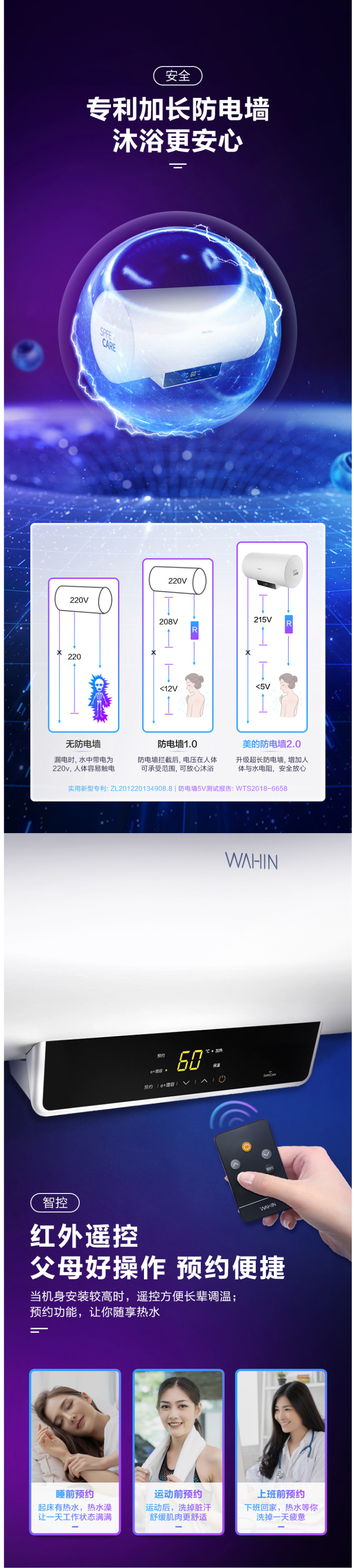 美的的安全防电墙2.0,加长防电墙设计,一旦出现漏电隐患,自动将电压从220V转化成5V,远低于人体电压36V,断电记忆功能,断电后再开启,自动恢复上次设置的温度,避免了重复操作。