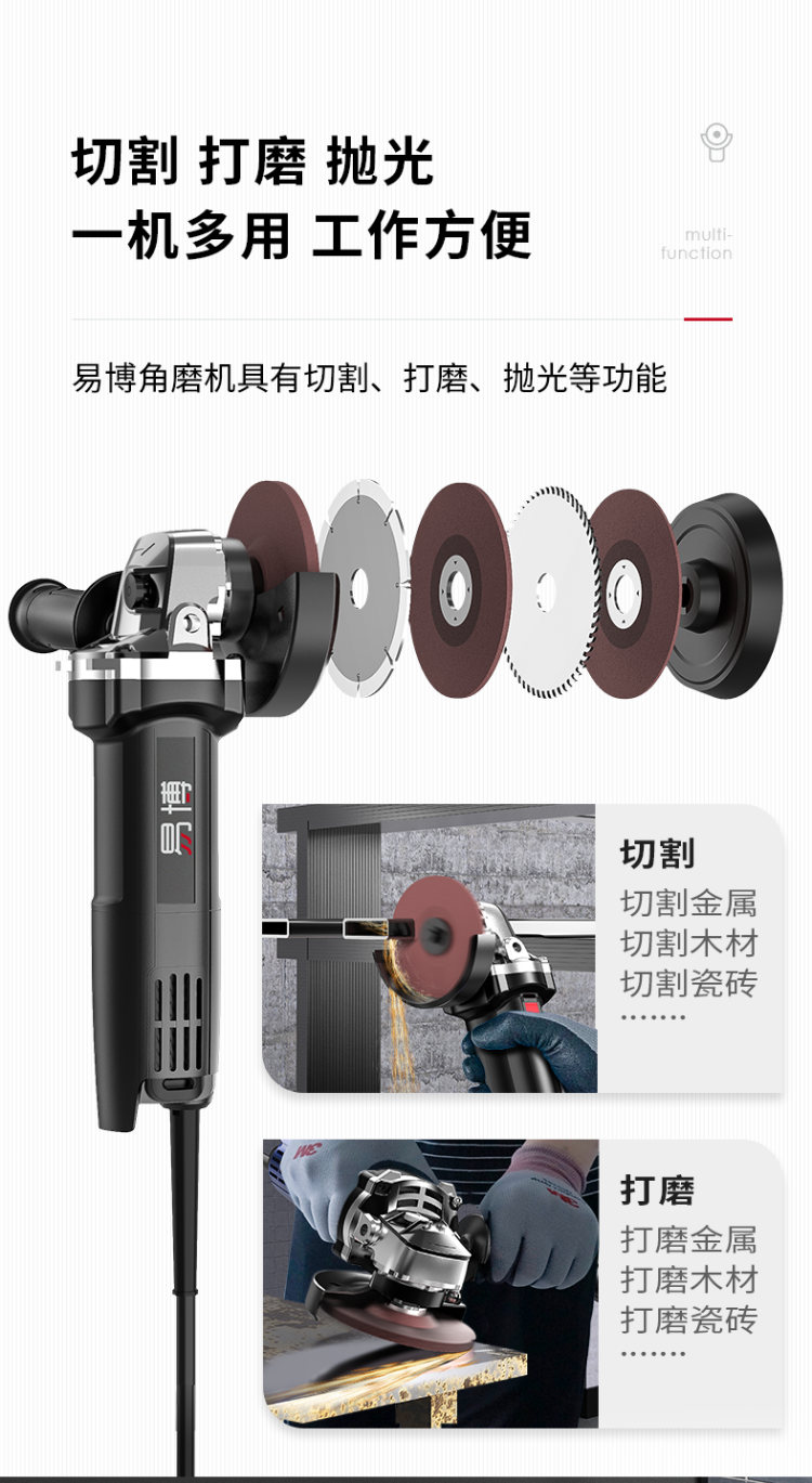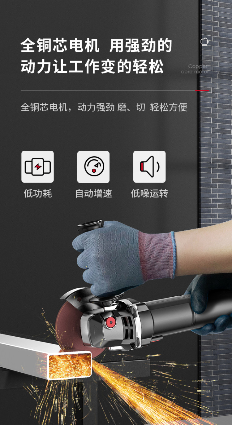 多功能电动角磨机,切割、打磨、抛光、除锈、全铜电机,合金齿轮,传动效率高,小蛮腰久握不累,双面辅助手柄,一台不发烫的角磨机。领券链接点此