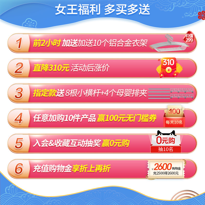 天猫好太太官方旗舰店5日售价2239元,跨店满减220元,再叠加20元优惠券,到手价1999元包邮,再加送、铝合金衣架10只装,买过的用户表示:不错不错,安装师傅服务很好,安装很到位,今天下单还有送衣架呢,买早了。