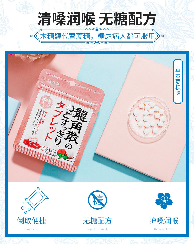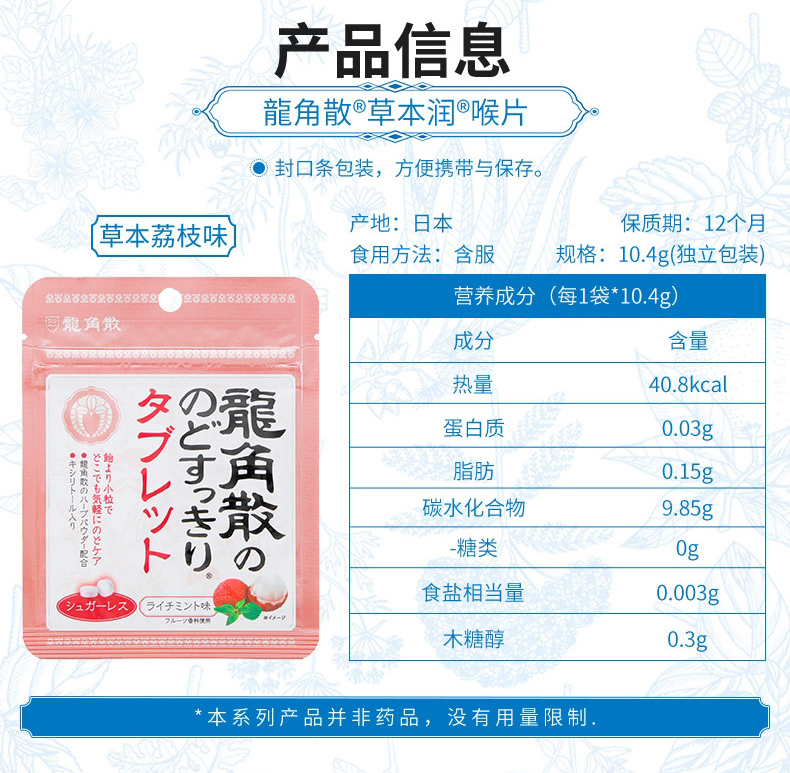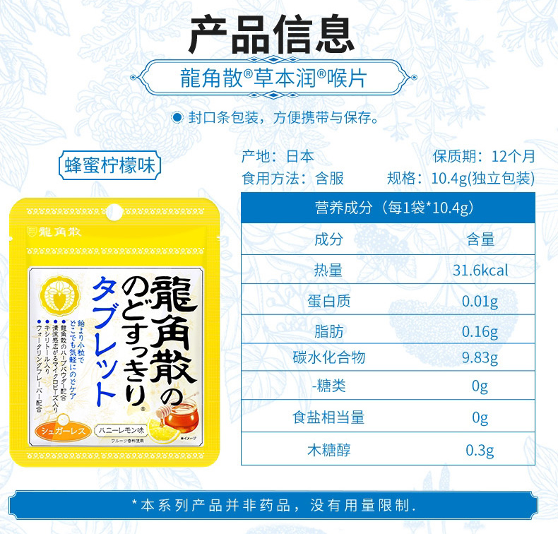 特别的龙角散生药配合,100微米细的龙角散粉末包覆于润喉糖的中心,瞬间滋润不适喉咙,对于除痰止咳,清肺、痰多,咽喉肿痛、咽喉炎症有一定的功效,特别是换季的时候,早晚温差大,容易引起长久的干咳和痰咳,家中常备药品,3岁以上宝宝都可以吃。