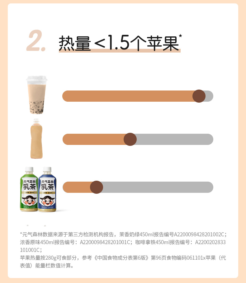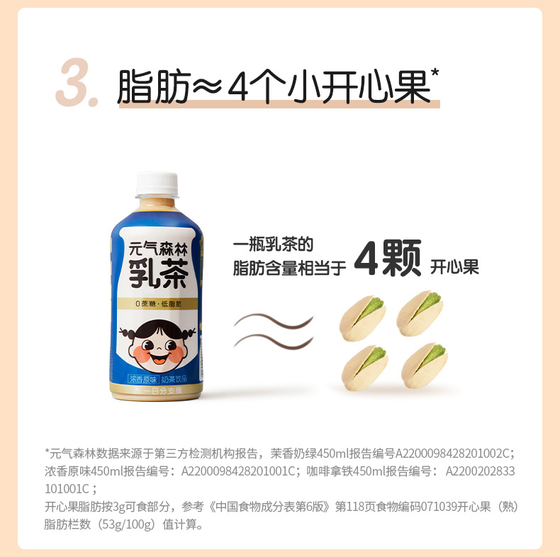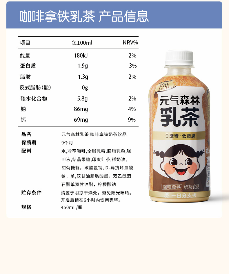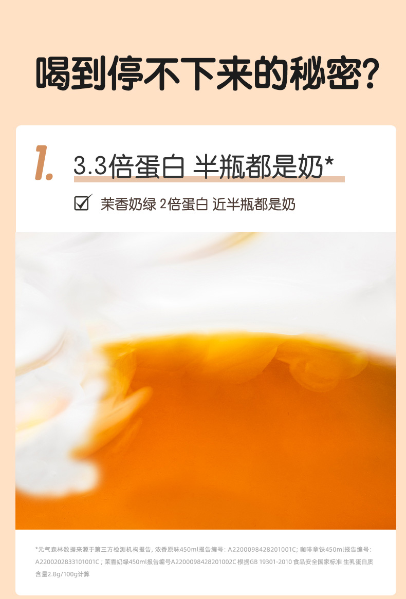 同时乳茶里蛋白含量高达8.5g,比国家标准多73%,根据乳粉和蛋白质换算含有不少于58.7%的牛奶含量,是其他瓶装奶茶的6倍。更没有防腐剂、植脂末、添加剂、反式脂肪酸的添加,配料简单干净。