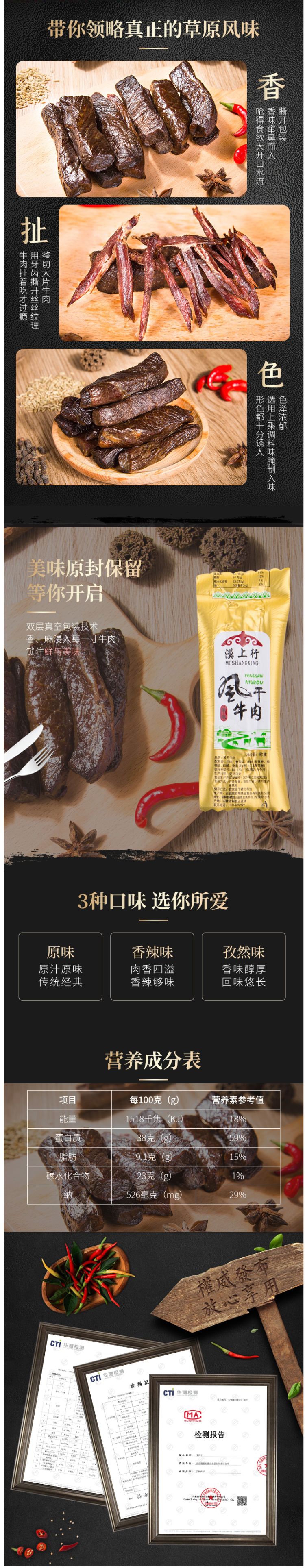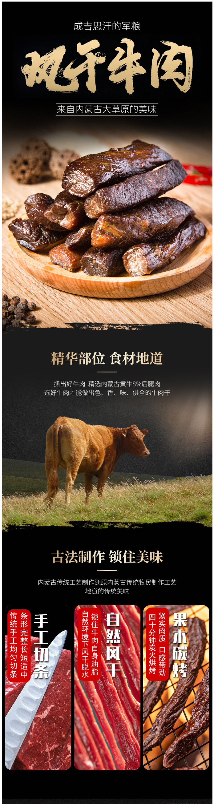 这款漠上行内蒙古手撕牛肉干,选用内蒙古自然放养黄牛的后腿肉,肉质紧实,纹理清晰;有别于现代工艺,采用传统蒙古族的工艺制程,是地道的手撕牛肉,肉干经手工切割、腌制、果木碳烤、自然风干等多道工序制作而成,丝丝入味,有嚼劲,双层真空包装。