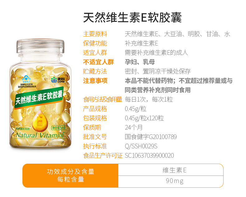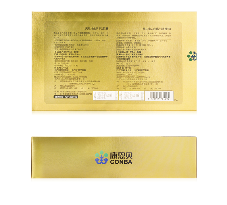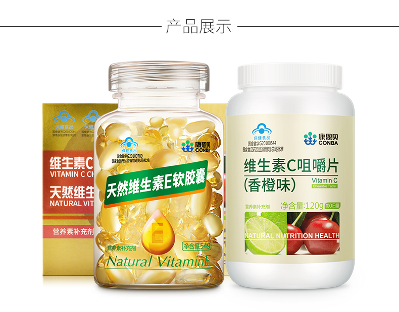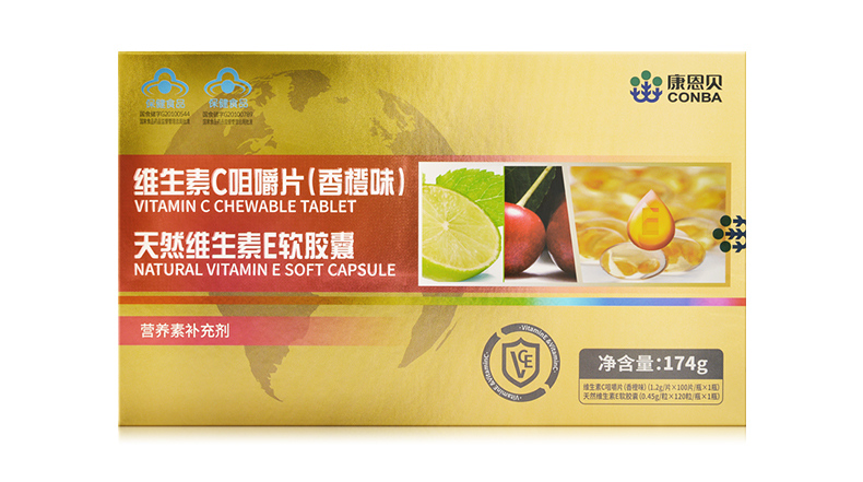 这款康恩贝拥有国家颁布的蓝帽子认证,可在国家食品药品监督管理局查询到。维生素C咀嚼片每粒含维生素C 213mg、维生素E软胶囊每粒含维生素E 90mg,两者共同服用,满足身体所需,同时搭配好吸收。