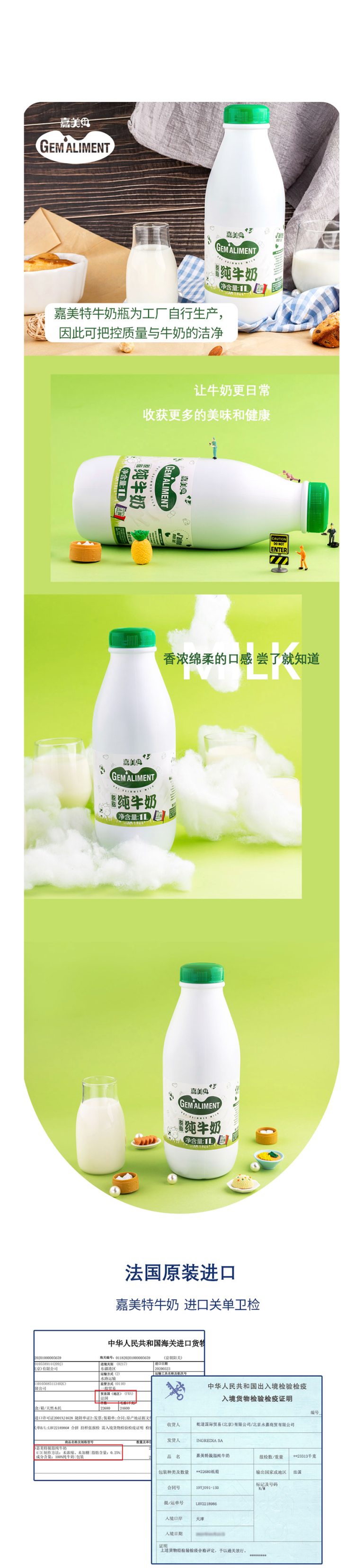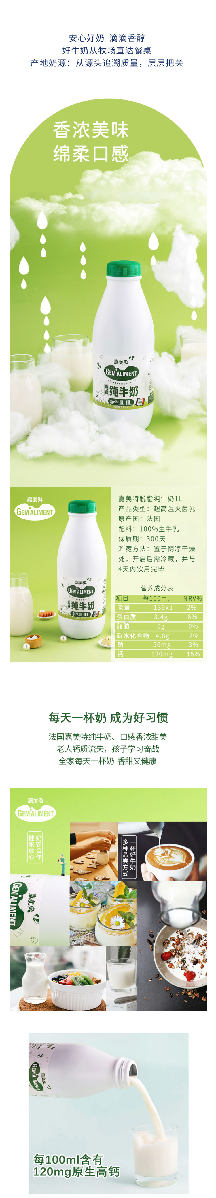 这款嘉美特脱脂纯牛奶,法国原装进口,非国内灌装,100%优质生牛乳,超高温杀菌,4℃锁鲜,0防腐剂、0香精、0色素添加,奶瓶均由工厂自行生产,严格把控质量与牛奶品质。