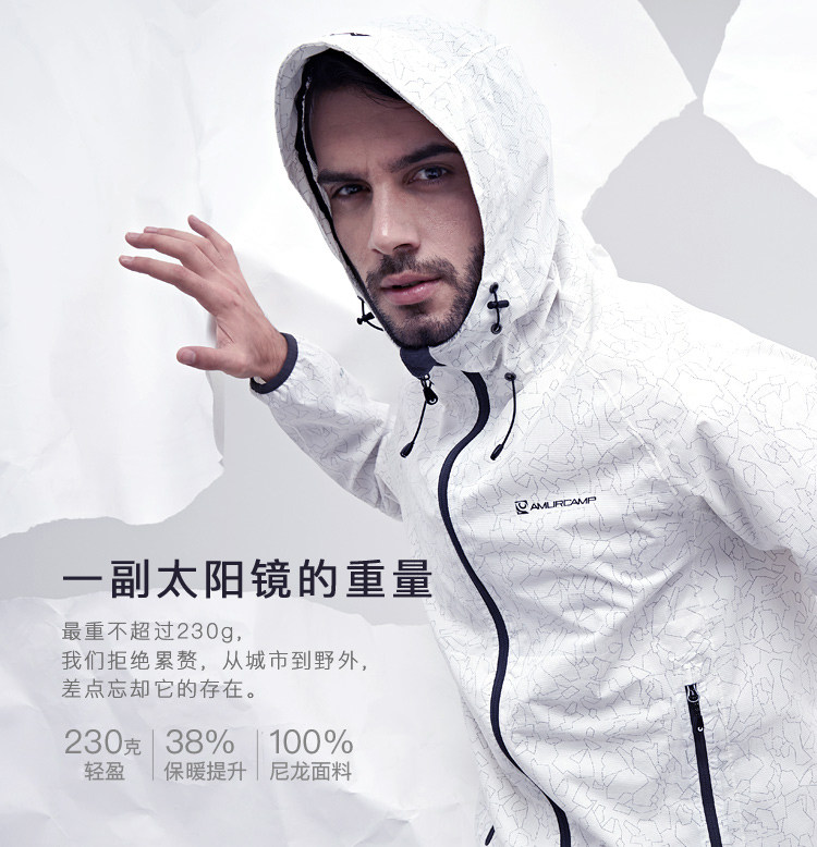 Amurcamp纸感系列冲锋衣,防水指数10000mm可防暴雨,直接当雨衣穿,透湿指数高达10000g激烈运动可穿;使用新颖的纸感面料,轻薄程度接近于纸,把冲锋衣的功能做到轻型风衣的重量,230克重量不到传统冲锋衣的一半。还拥有UPF 50+的50倍防晒功能。