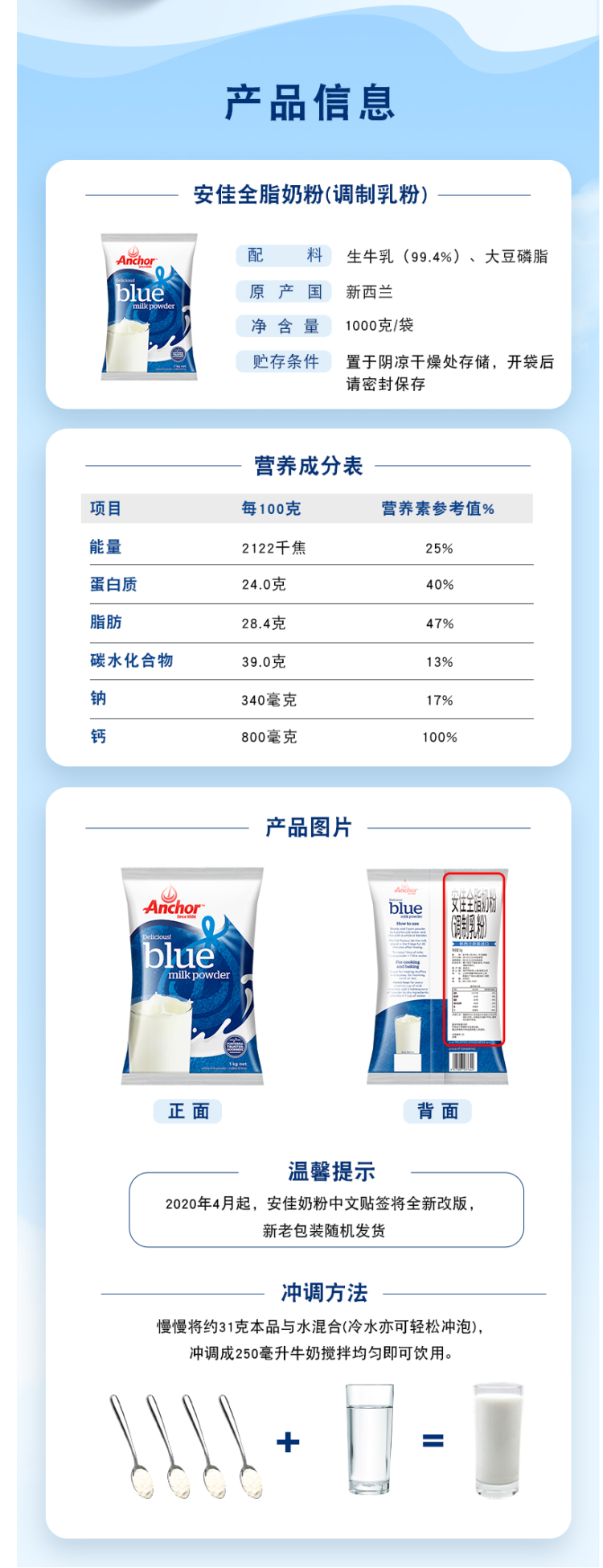天猫anchor安佳官方旗舰店158元,下单立减10元,可领45元优惠券,实付103元到手,规格是1kg*2袋。安佳Anchor是新西兰最大的乳制品生产公司Fonterra恒天然旗下品牌,新西兰的天然环境近乎于纯净,而且对于乳制品,新西兰有专门的立法监管体系,所以安佳也是我最信任的牌子之一。