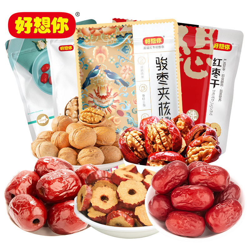 选择一:天猫超市好想你 枣夹核桃 坚果零食年货礼盒 1376g售价69元,(领6元品牌优惠券)+良品铺子紫米面包555g售价29.9元,各下单一件参加满2件5折活动;