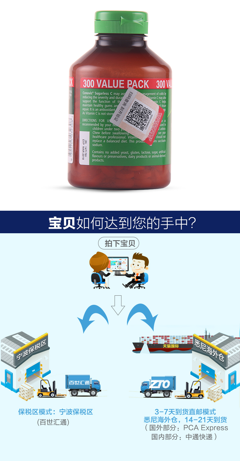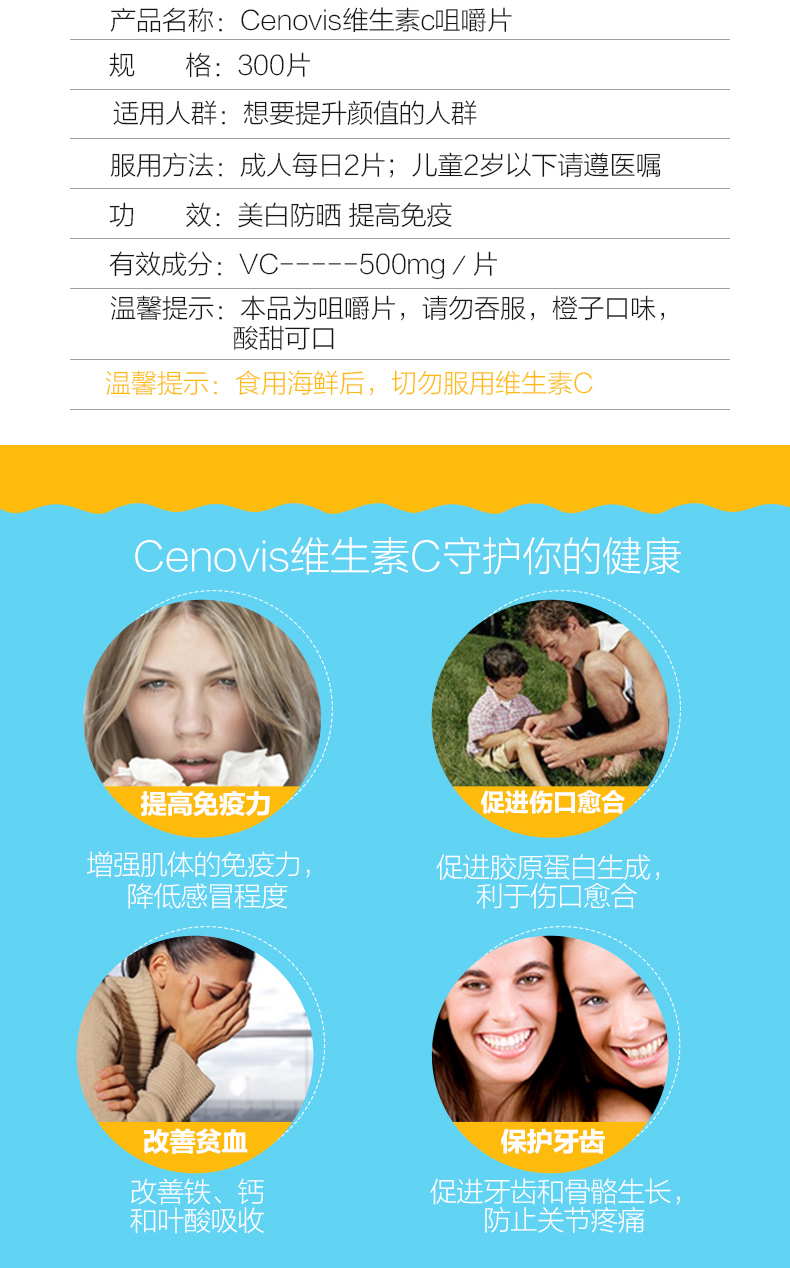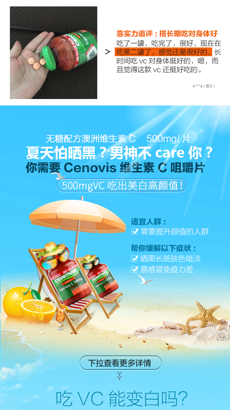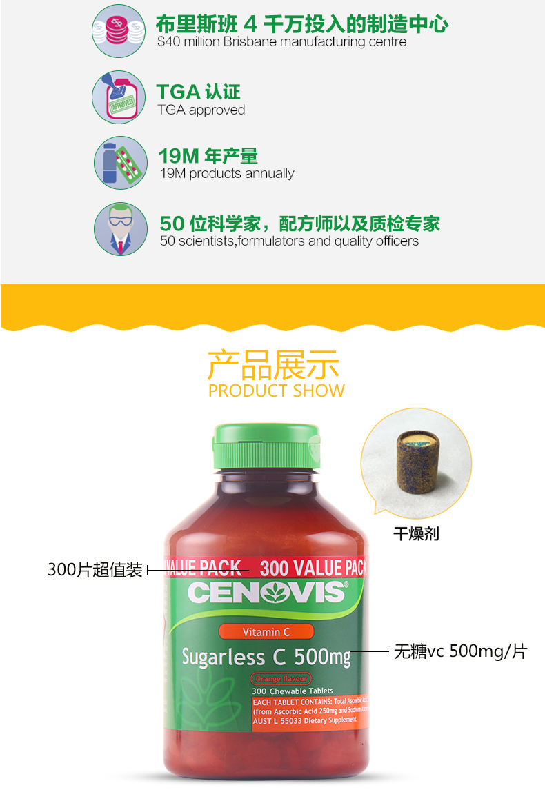 这款Cenovis维生素C咀嚼片,1000%澳洲原装进口,每片含维生素C 500mg(抗坏血酸250mg,抗坏血酸钠281mg),一片相当于20个橙子,天然橙味,酸酸甜甜的口感大家都爱吃,酸酸甜甜的口感大家都爱吃,特别是无糖配方的设计,连糖尿病人都可服用,一直服用也不担心会蛀牙或者发胖。